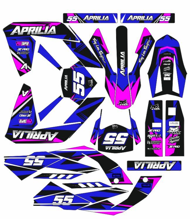 Pour une personnalisation encore plus poussée, vous pouvez customiser votre Kit déco APRILIA 50 RX / SX (2006 – 2017) – Craft Bleu / Rose avec nos différentes options comme la base du Kit déco, la finition et pourquoi pas ajouter votre pseudo ou bien changer le numéro.
