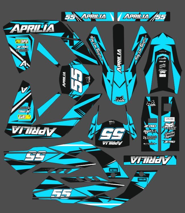 Pour une personnalisation encore plus poussée, vous pouvez customiser votre Kit déco APRILIA 50 RX / SX (2006 – 2017) – Craft Cyan avec nos différentes options comme la base du Kit déco, la finition et pourquoi pas ajouter votre pseudo ou bien changer le numéro.