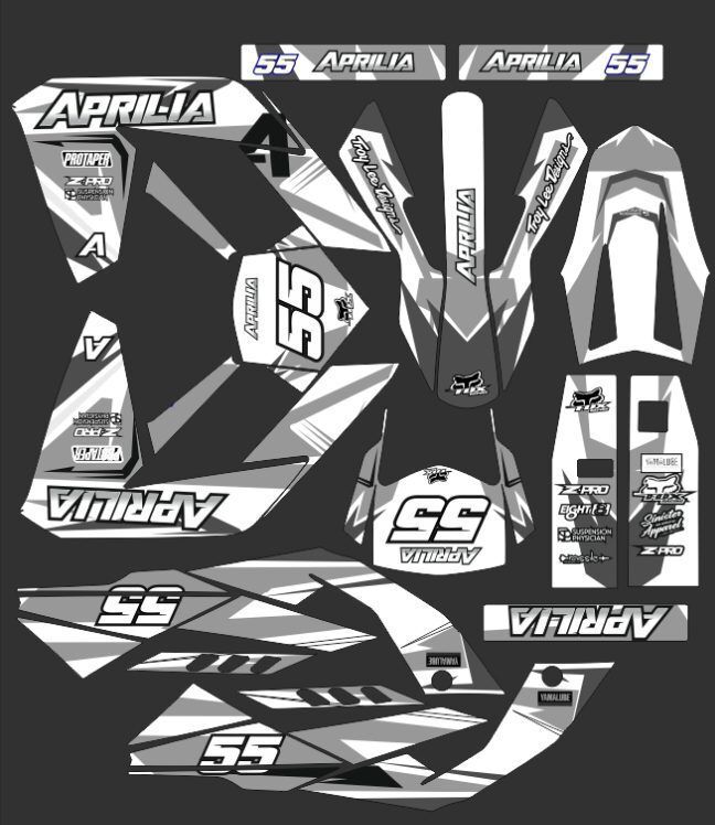 Pour une personnalisation encore plus poussée, vous pouvez customiser votre Kit déco APRILIA 50 RX / SX (2006 – 2017) – Craft Gris avec nos différentes options comme la base du Kit déco, la finition et pourquoi pas ajouter votre pseudo ou bien changer le numéro.
