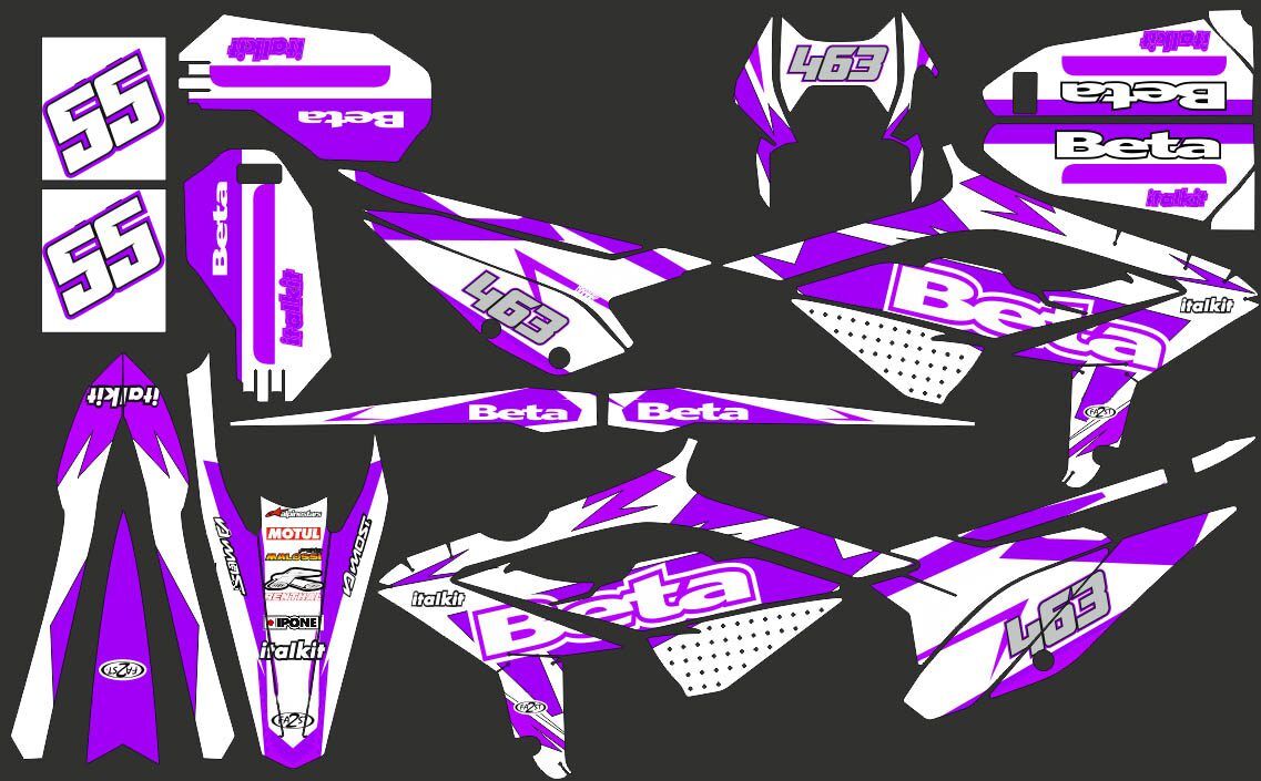 Pour une personnalisation encore plus poussée, vous pouvez customiser votre Kit déco Beta 50 (2021-2023) – Craft Violet / Blanc avec nos différentes options comme la base du Kit déco, la finition et pourquoi pas ajouter votre pseudo ou bien changer le numéro.