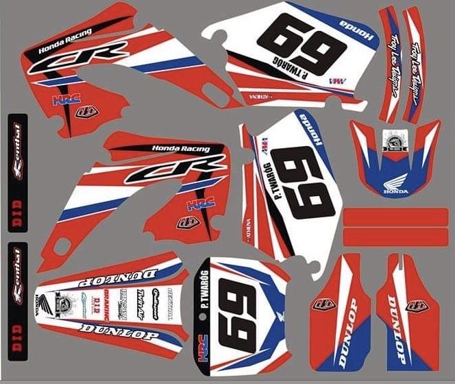 Kitdeco-moto.fr vous propose ce kit déco compatible pour Honda motocross / enduro / supermotard 65, 85, 250, 450, 500, CR, CRF !