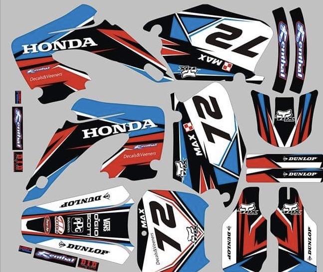 Kitdeco-moto.fr vous propose ce kit déco compatible pour Honda motocross / enduro / supermotard 65, 85, 250, 450, 500, CR, CRF !