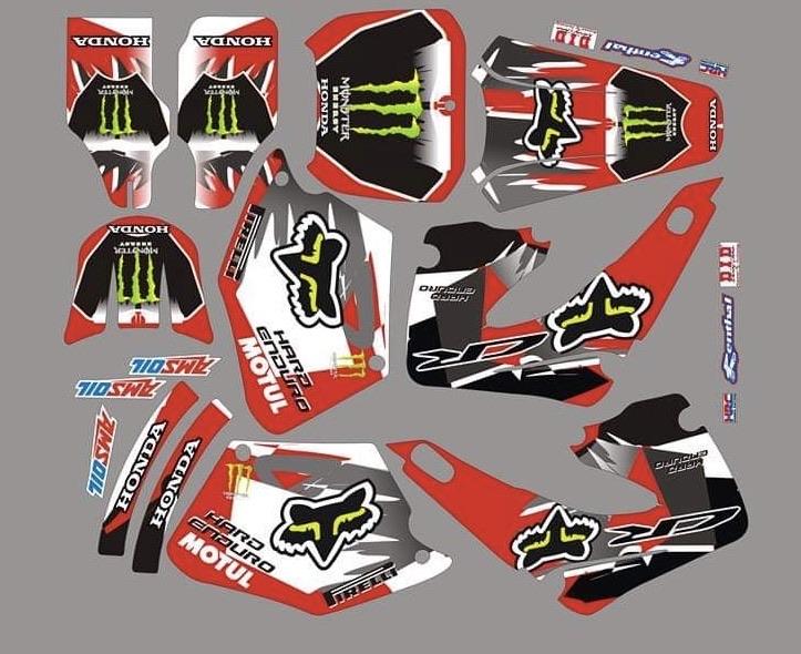 Kitdeco-moto.fr vous propose ce kit déco compatible pour Honda motocross / enduro / supermotard 65, 85, 250, 450, 500, CR, CRF !