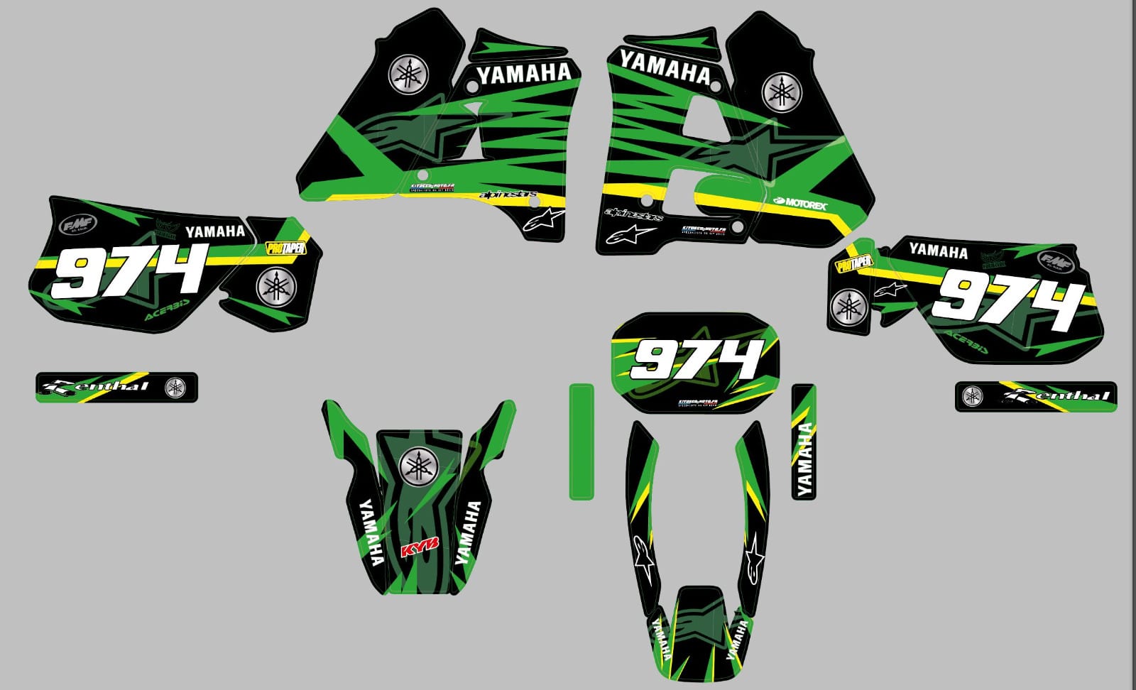 Pour une personnalisation encore plus poussée, vous pouvez customiser votre Kit déco Yamaha DT 125 – Green avec nos différentes options comme la base du Kit déco, la finition et pourquoi pas ajouter votre pseudo ou bien changer le numéro.