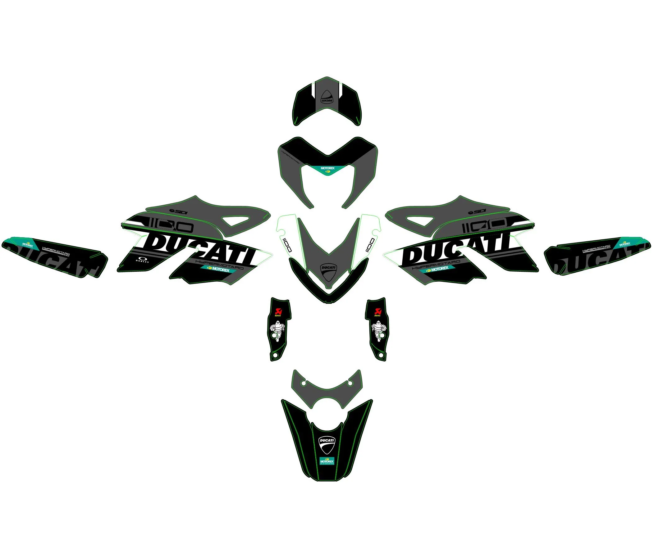 Pour une personnalisation encore plus poussée, vous pouvez customiser votre Kit déco Ducati Hypermotard 796 / 1100 – Rex avec nos différentes options comme la base du Kit déco, la finition et pourquoi pas ajouter votre pseudo ou bien changer le numéro.