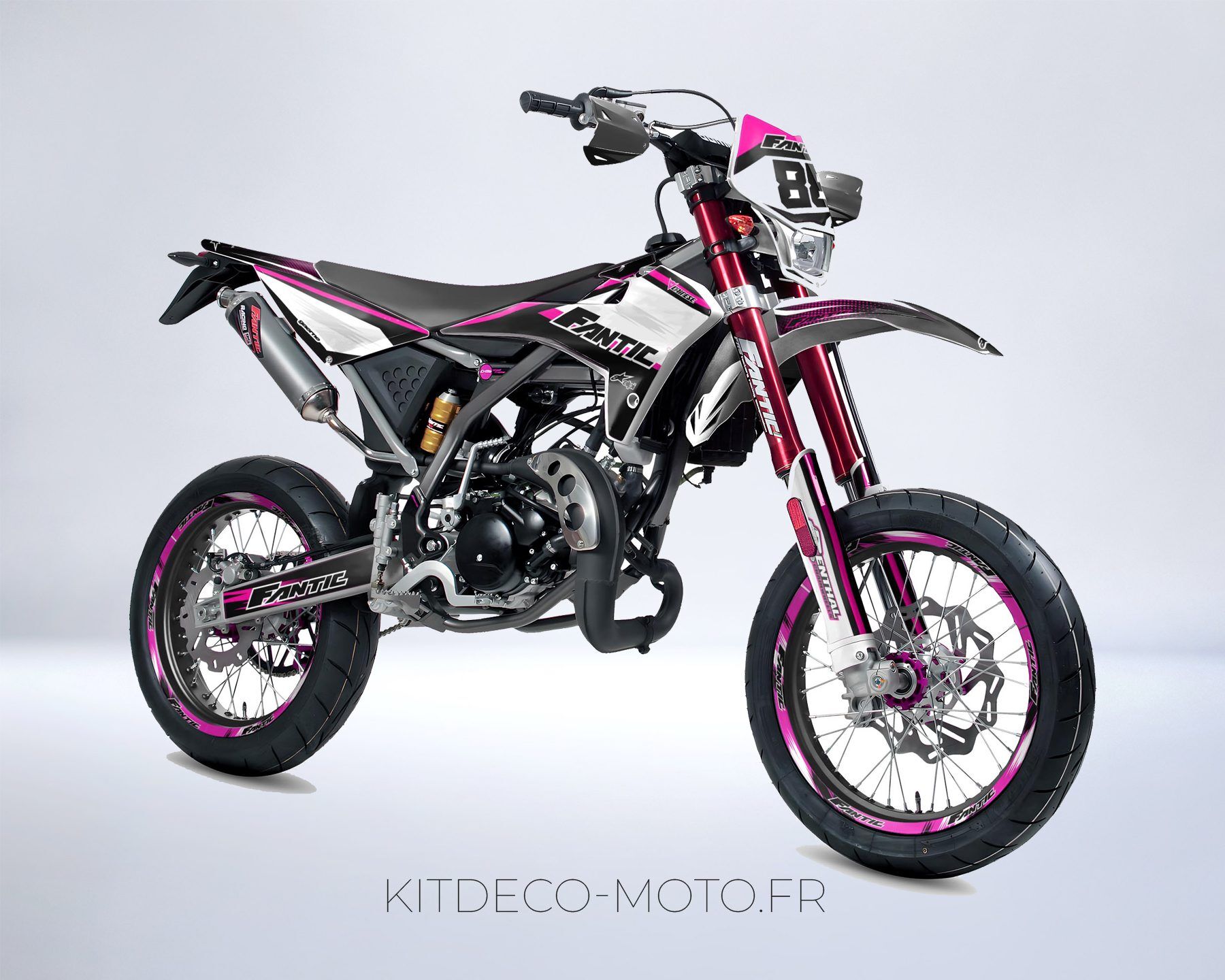 Pour une personnalisation encore plus poussée, vous pouvez customiser votre Kit déco Fantic XM / XE 50 – Factory Rose avec nos différentes options comme la base du Kit déco, la finition et pourquoi pas ajouter votre pseudo ou bien changer le numéro.