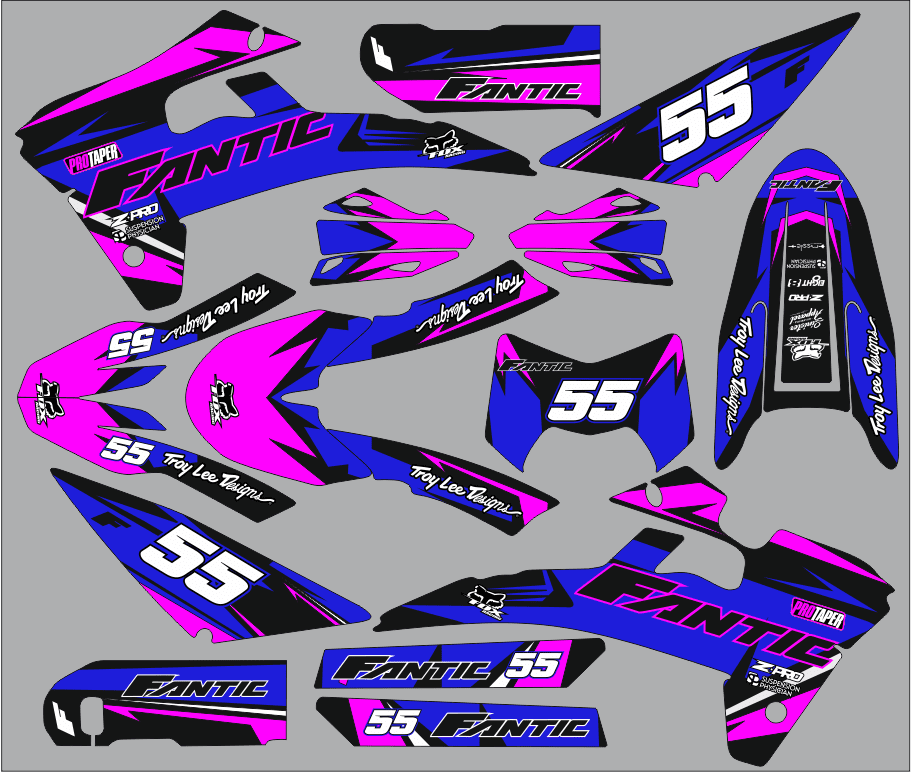 Pour une personnalisation encore plus poussée, vous pouvez customiser votre Kit déco Fantic XM / XE 50 – Craft Bleu / Rose avec nos différentes options comme la base du Kit déco, la finition et pourquoi pas ajouter votre pseudo ou bien changer le numéro.