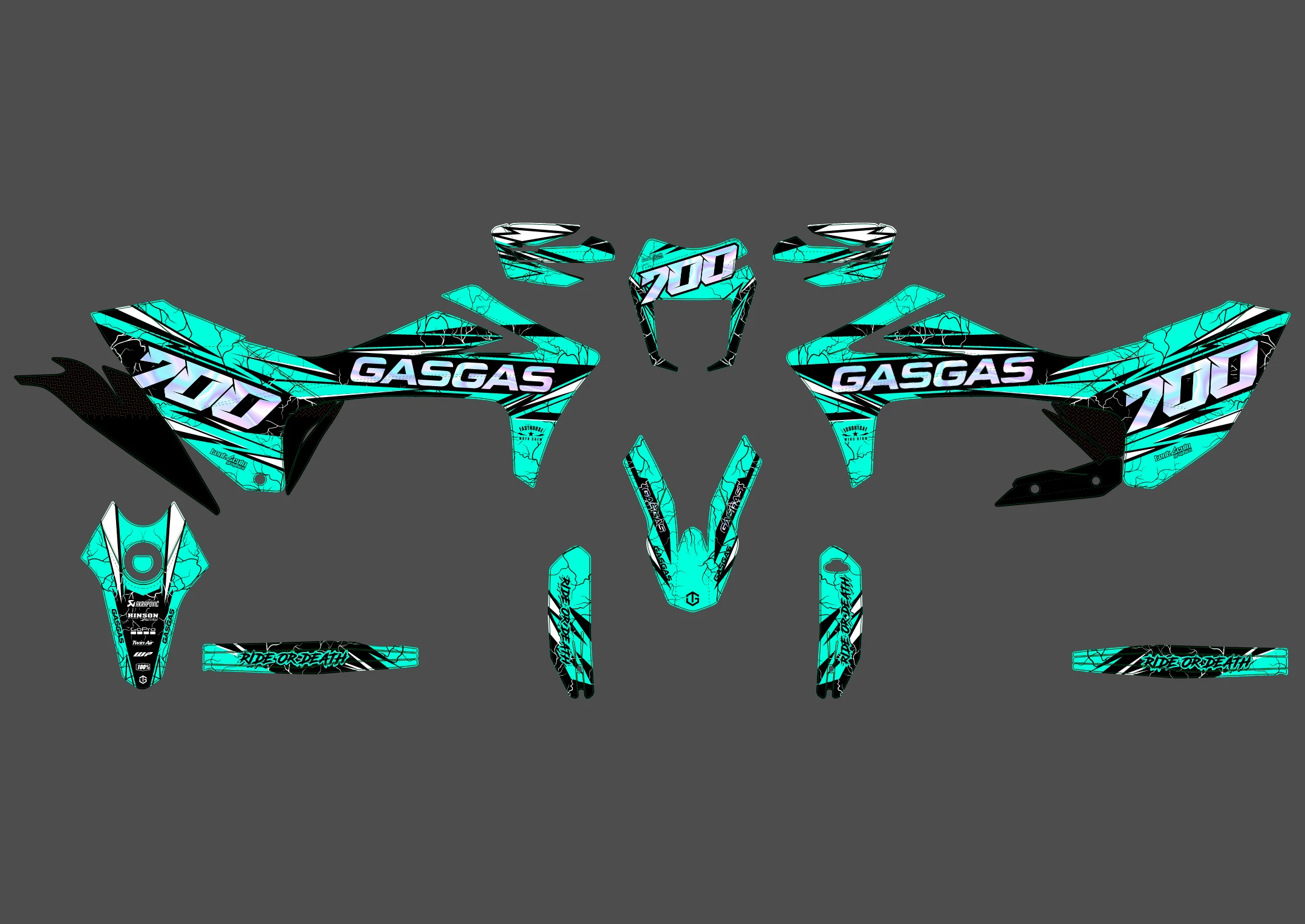Pour une personnalisation encore plus poussée, vous pouvez customiser votre Kit déco Gasgas 700 SM / ES – Eclair Cyan avec nos différentes options comme la base du Kit déco, la finition et pourquoi pas ajouter votre pseudo ou bien changer le numéro.