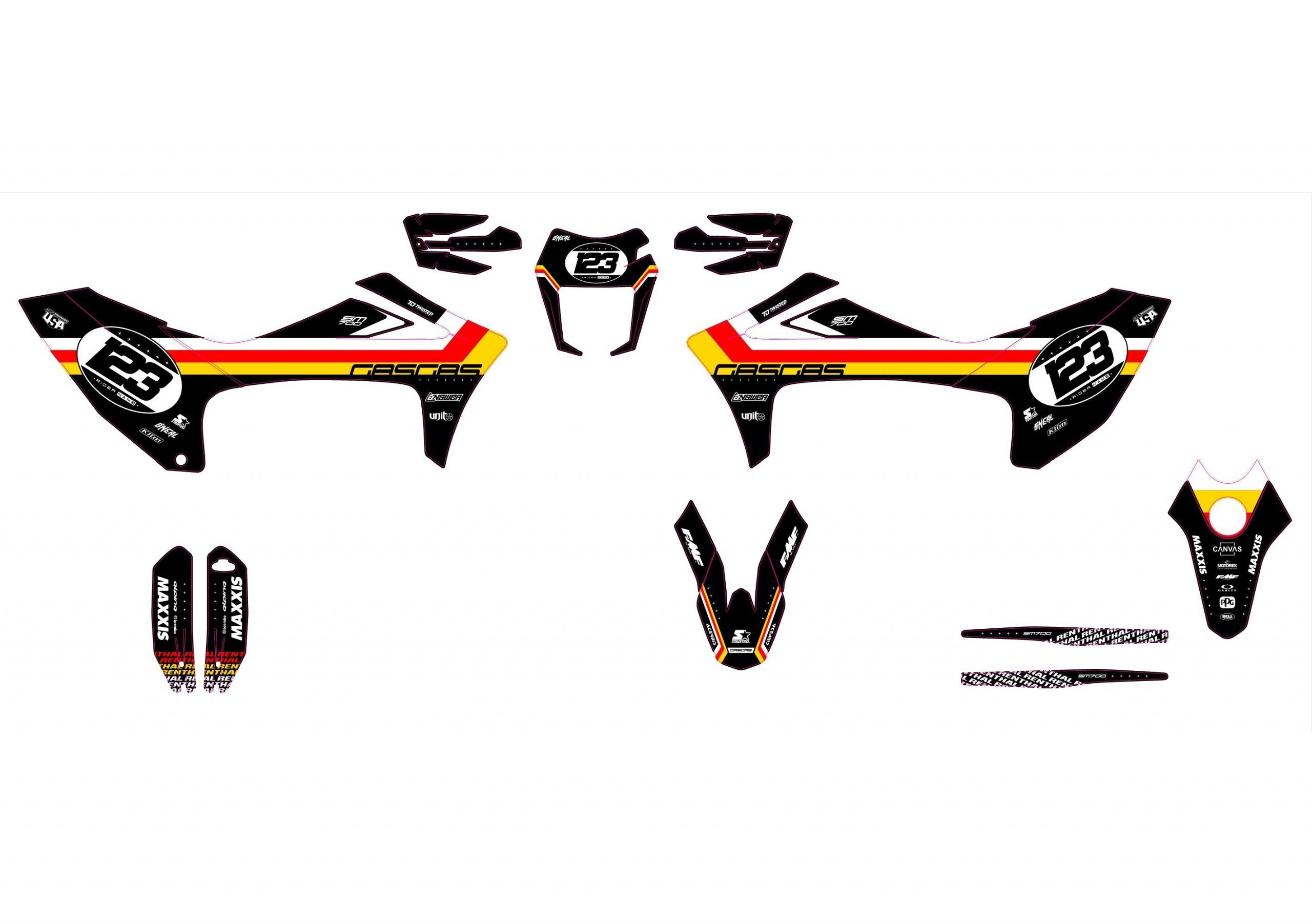 Pour une personnalisation encore plus poussée, vous pouvez customiser votre Kit déco Gasgas 700 SM / ES – Ligne avec nos différentes options comme la base du Kit déco, la finition et pourquoi pas ajouter votre pseudo ou bien changer le numéro.