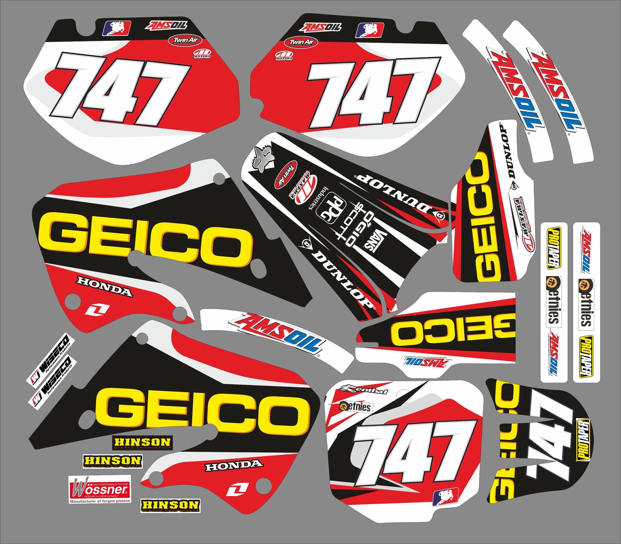 Le Kit déco Honda 125 / 250 CR (1997-1999) – Geico #3 est parfait pour avoir une Honda 125 / 250 CR unique et décorée. Le Kit déco Honda 125 / 250 CR (1997-1999) – Geico #3 est fabriqué avec des matériaux spécialement conçus pour les sports mécaniques. Il bénéficie d’une protection anti-UV qui lui assure une très grande longévité. Vous pourrez le choisir en différentes épaisseurs, allant de 200 microns à 550 microns.