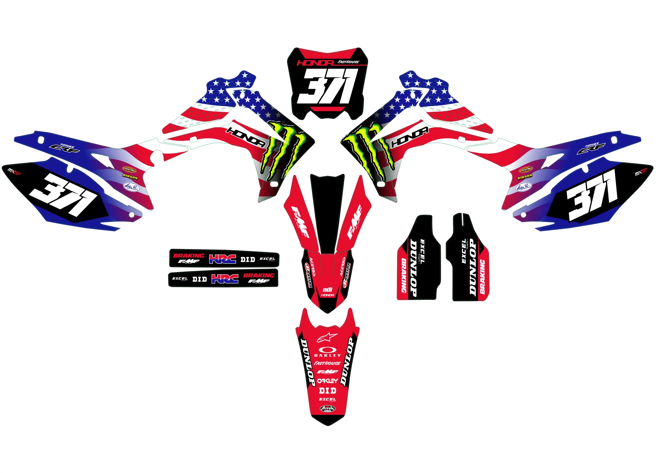 Pour une personnalisation encore plus poussée, vous pouvez customiser votre Kit déco Honda 250 CRF (2014-2017) – Monster USA avec nos différentes options comme la base du Kit déco, la finition et pourquoi pas ajouter votre pseudo ou bien changer le numéro.