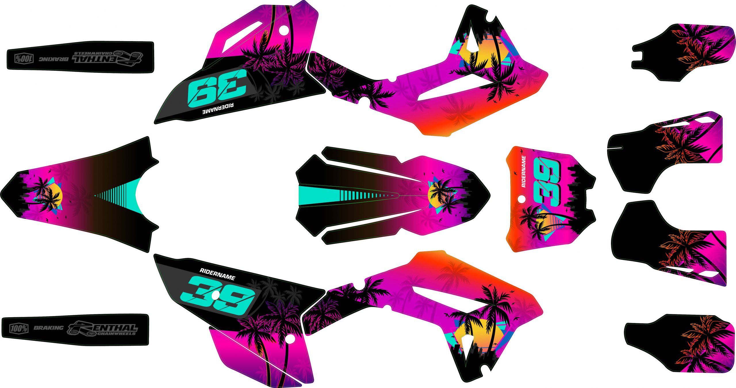 Pour une personnalisation encore plus poussée, vous pouvez customiser votre Kit déco Honda 250 CRF (2022-2024) – Miami avec nos différentes options comme la base du Kit déco, la finition et pourquoi pas ajouter votre pseudo ou bien changer le numéro.