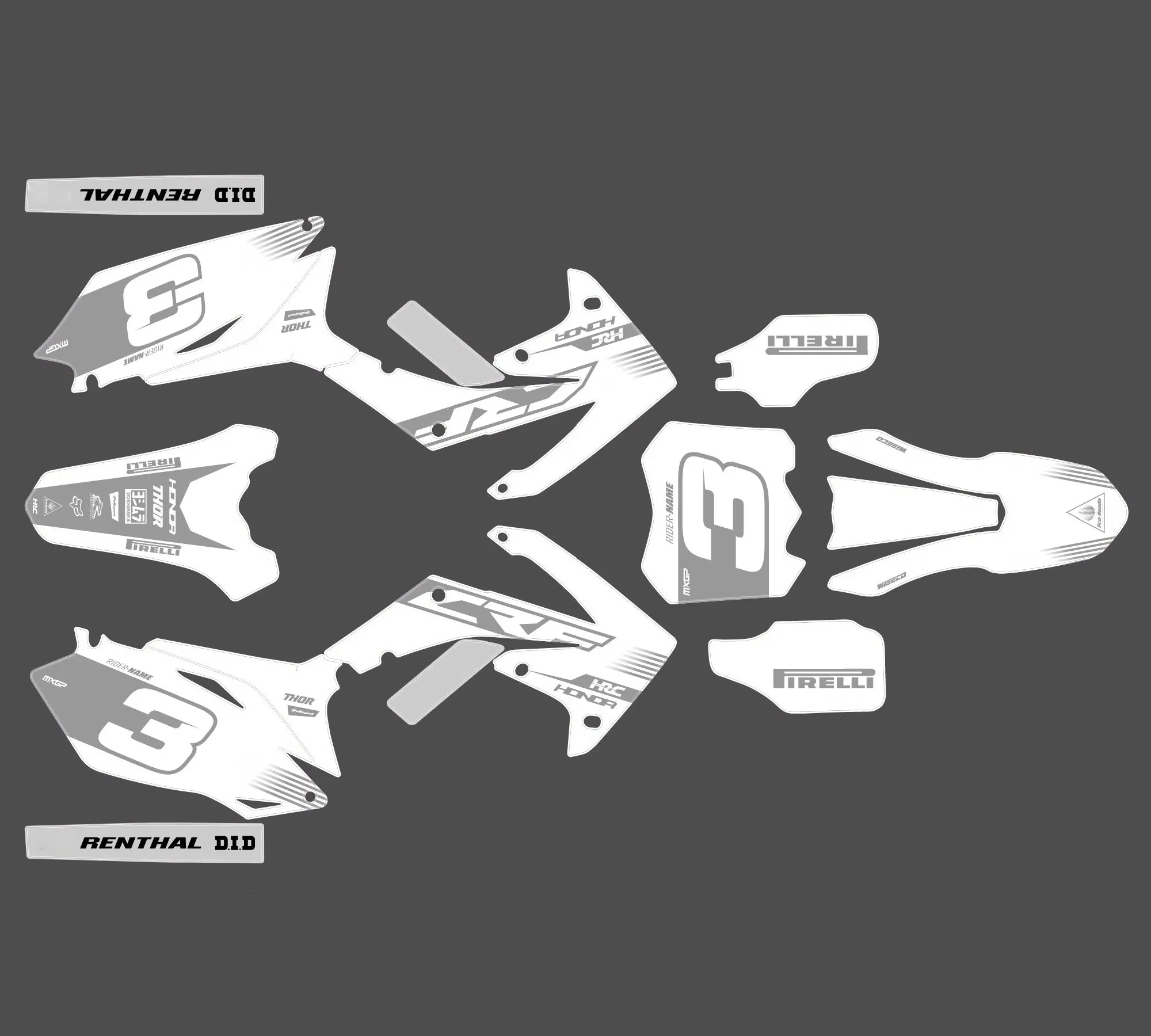 Pour une personnalisation encore plus poussée, vous pouvez customiser votre Kit déco Honda 450 CRF (2009-2012) – Factory Blanc avec nos différentes options comme la base du Kit déco, la finition et pourquoi pas ajouter votre pseudo ou bien changer le numéro.