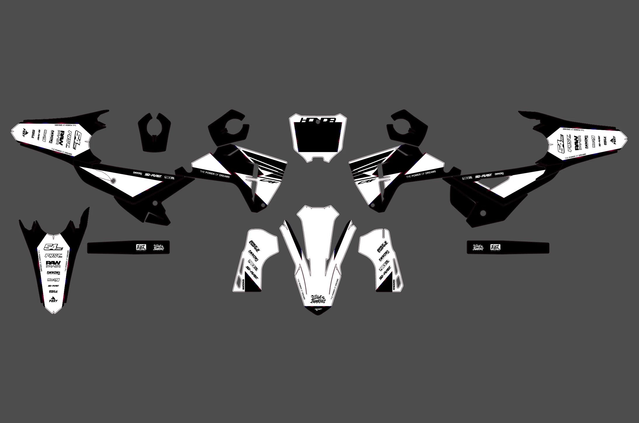 Pour une personnalisation encore plus poussée, vous pouvez customiser votre Kit déco Honda 450 CRF (2025) – Factory Blanc avec nos différentes options comme la base du Kit déco, la finition et pourquoi pas ajouter votre pseudo ou bien changer le numéro.