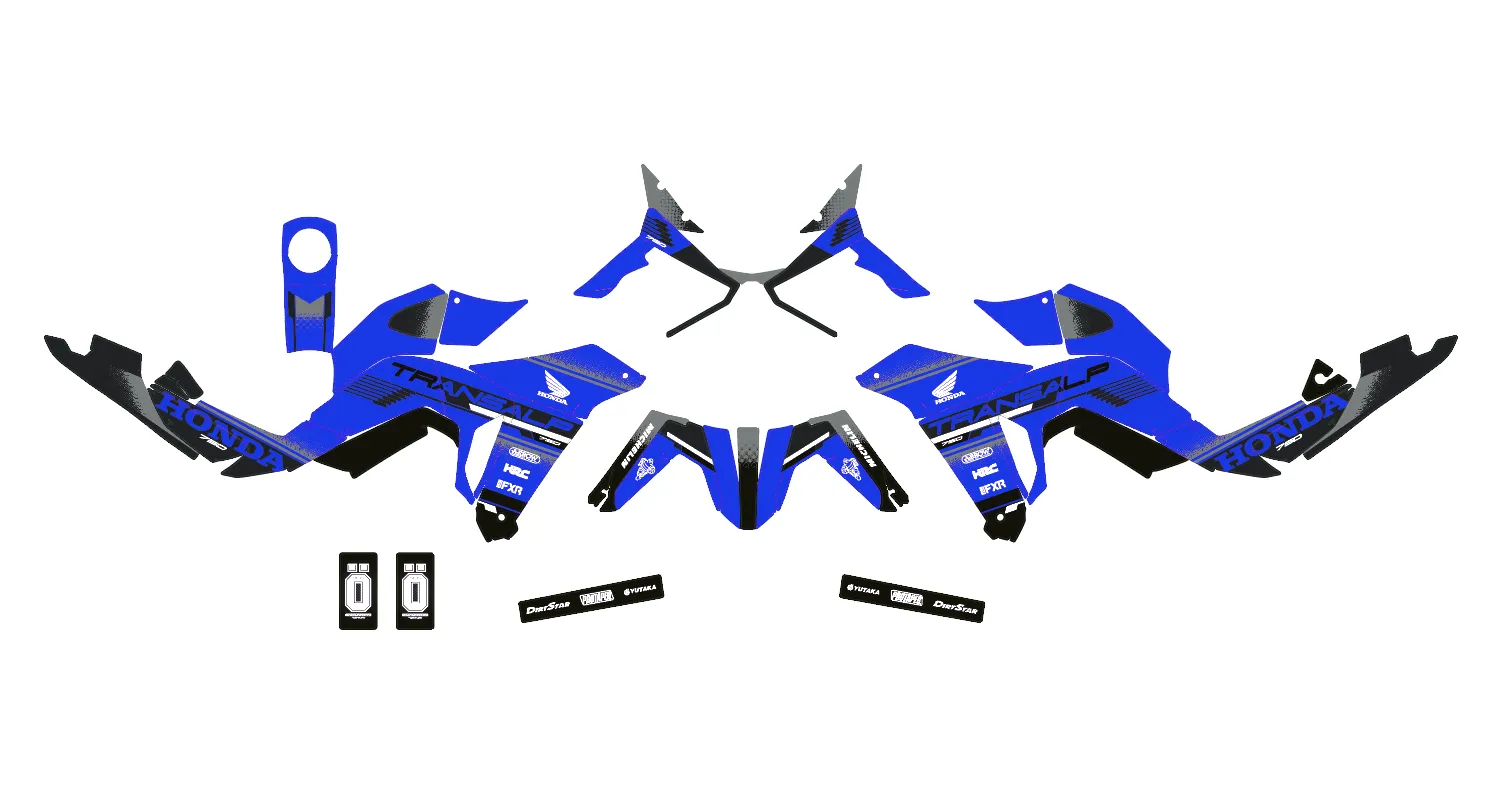 Pour une personnalisation encore plus poussée, vous pouvez customiser votre Kit déco Honda Transalp 750 – City Bleu avec nos différentes options comme la base du Kit déco, la finition et pourquoi pas ajouter votre pseudo ou bien changer le numéro.
