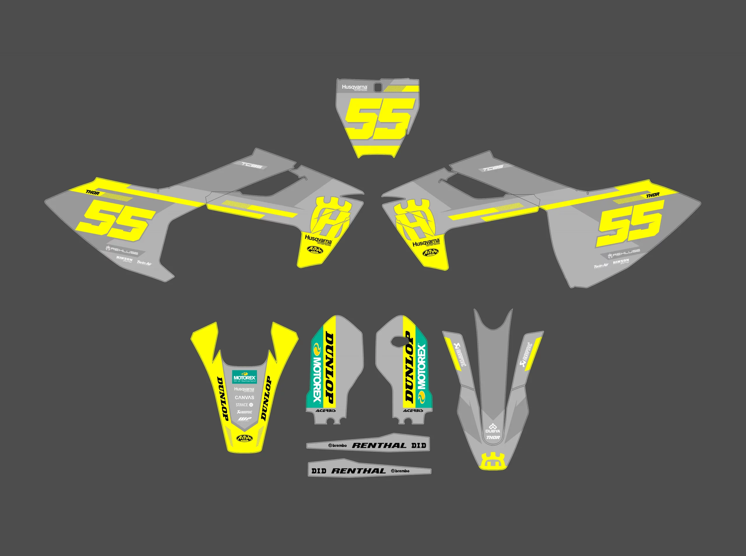 Pour une personnalisation encore plus poussée, vous pouvez customiser votre Kit déco Husqvarna 85 TC (2018-2024) – Factory Gris avec nos différentes options comme la base du Kit déco, la finition et pourquoi pas ajouter votre pseudo ou bien changer le numéro.