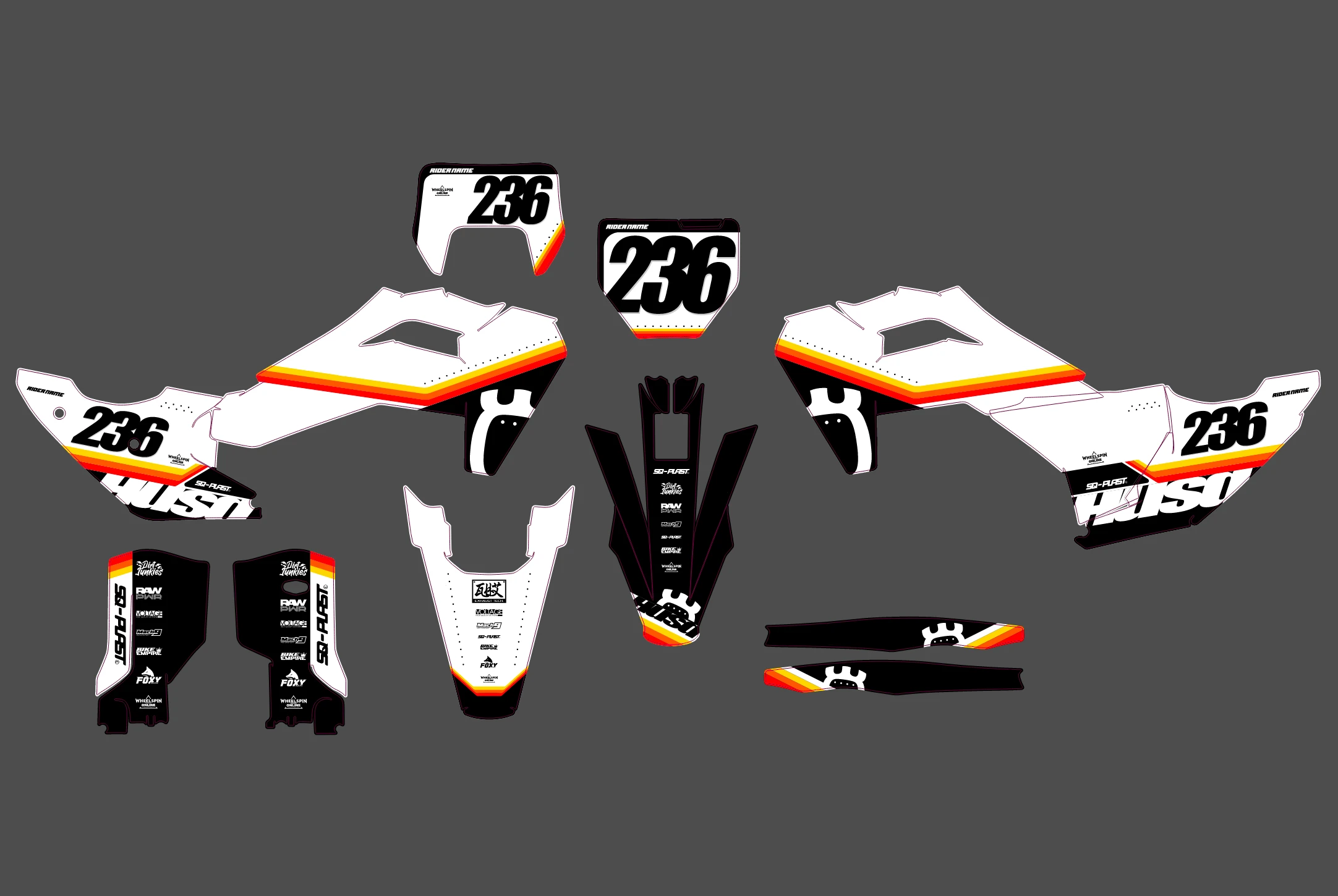 Pour une personnalisation encore plus poussée, vous pouvez customiser votre Kit déco Husqvarna TC / FC (2025) – Line avec nos différentes options comme la base du Kit déco, la finition et pourquoi pas ajouter votre pseudo ou bien changer le numéro.