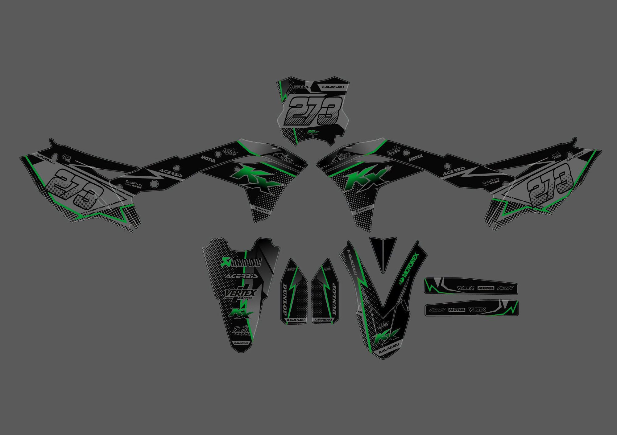 Pour une personnalisation encore plus poussée, vous pouvez customiser votre Kit déco Kawasaki 250 KXF (2017-2020) – Race Gris avec nos différentes options comme la base du Kit déco, la finition et pourquoi pas ajouter votre pseudo ou bien changer le numéro.
