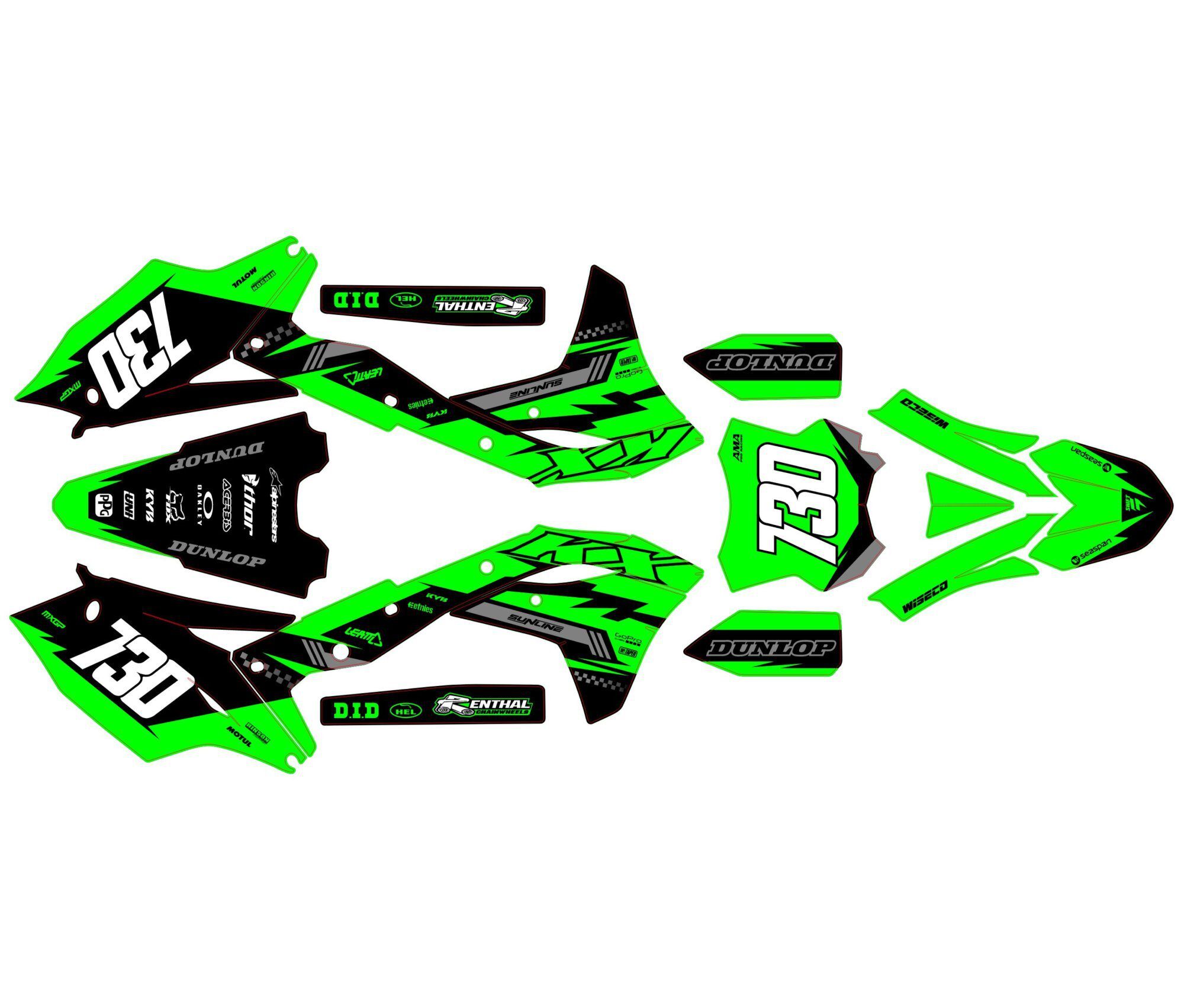Pour une personnalisation encore plus poussée, vous pouvez customiser votre Kit déco Kawasaki 250 KXF (2017-2020) – Race Vert avec nos différentes options comme la base du Kit déco, la finition et pourquoi pas ajouter votre pseudo ou bien changer le numéro.