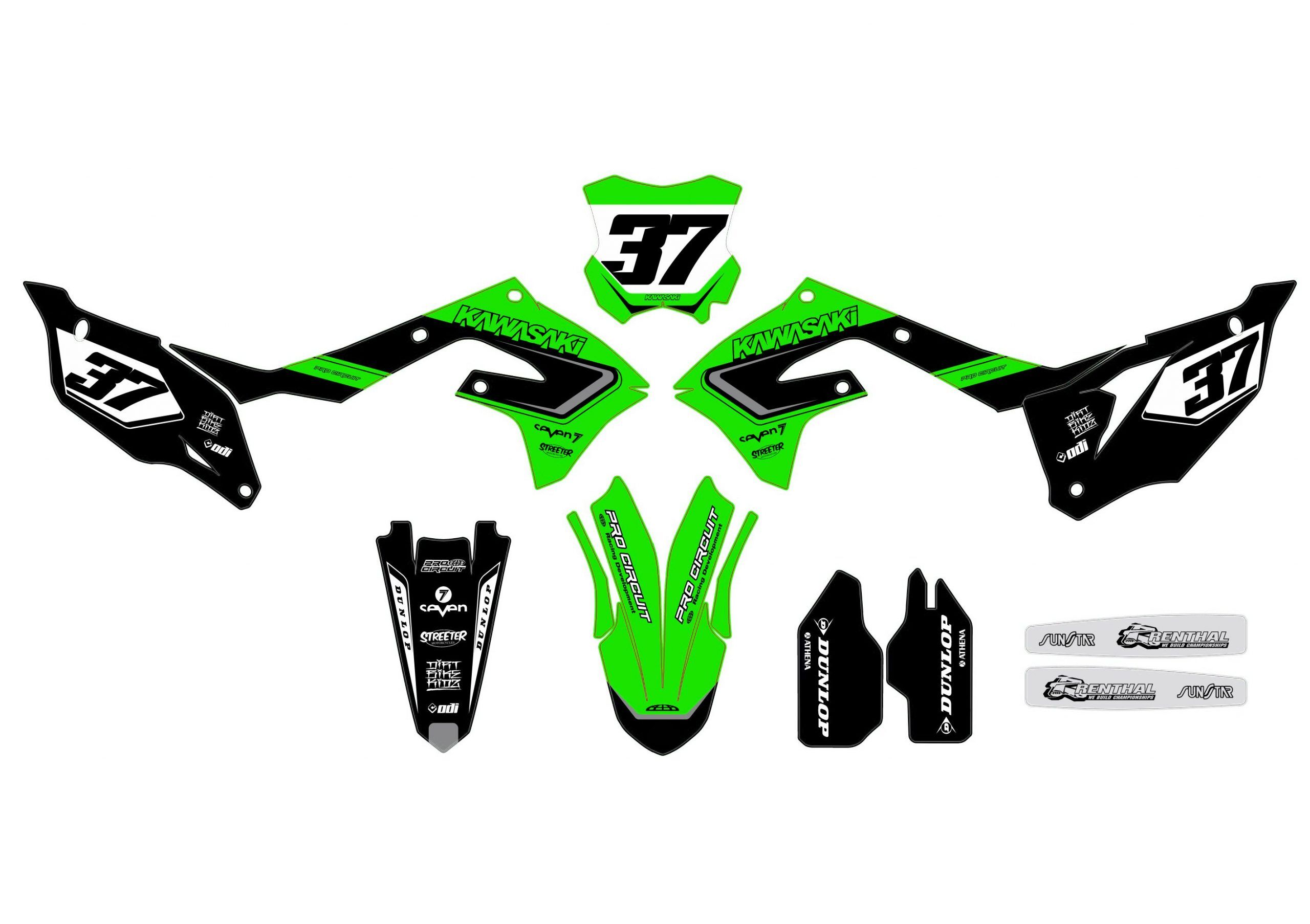 Kitdeco-moto.fr vous propose ce kit déco compatible pour Kawasaki 250 KXF de 2021 à 2024 !
