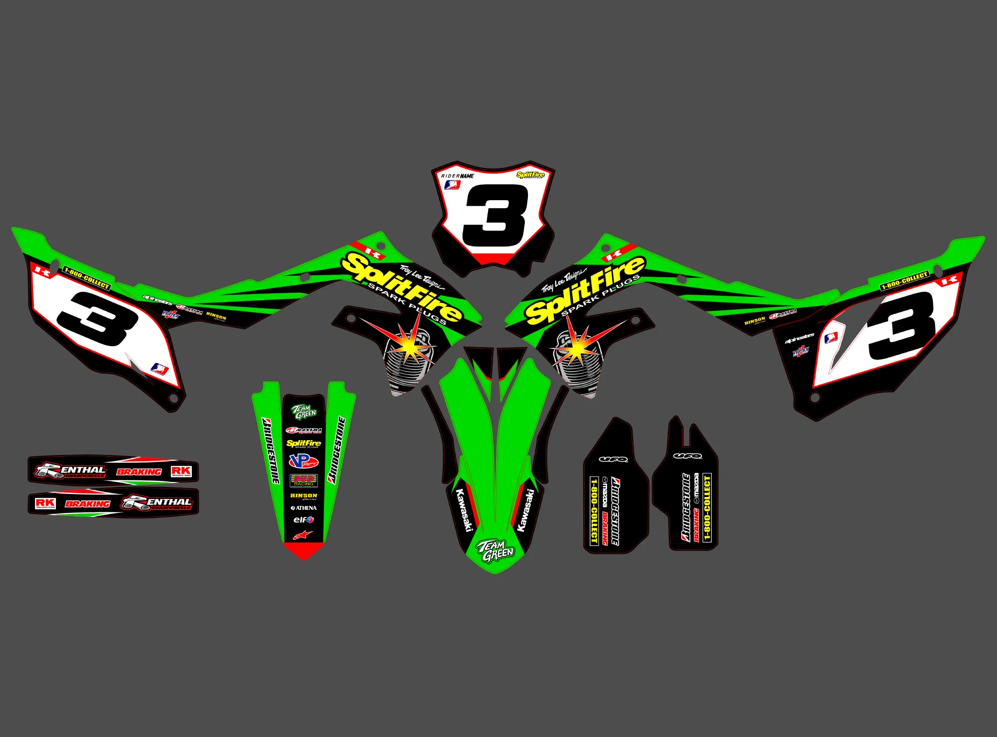 Pour une personnalisation encore plus poussée, vous pouvez customiser votre Kit déco Kawasaki 250 KXF (2021-2024) – Splitfire avec nos différentes options comme la base du Kit déco, la finition et pourquoi pas ajouter votre pseudo ou bien changer le numéro.
