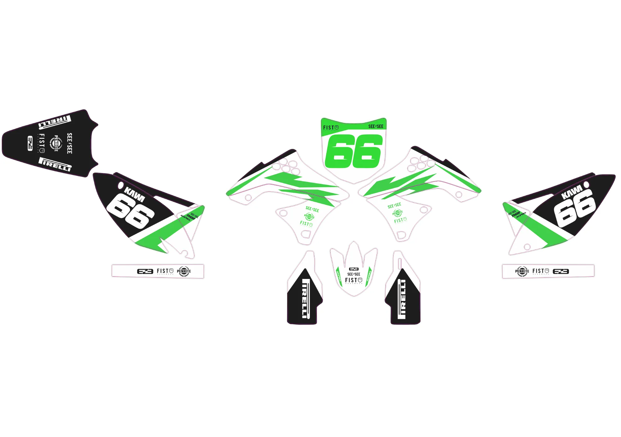 Pour une personnalisation encore plus poussée, vous pouvez customiser votre Kit déco Kawasaki 450 KXF (2009-2011) – Craft Vert avec nos différentes options comme la base du Kit déco, la finition et pourquoi pas ajouter votre pseudo ou bien changer le numéro.