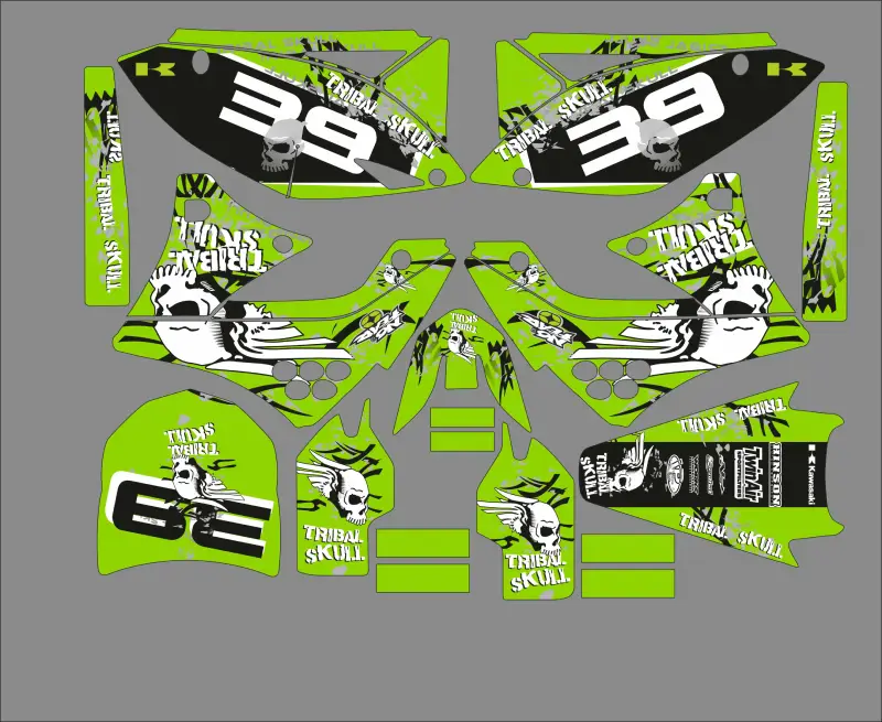 👉 Pour une pose facile et sans bulle, nous vous conseillons de choisir votre Kit déco Kawasaki 450 KXF (2009-2011) – Tribal Vert en épaisseur de 550 microns.