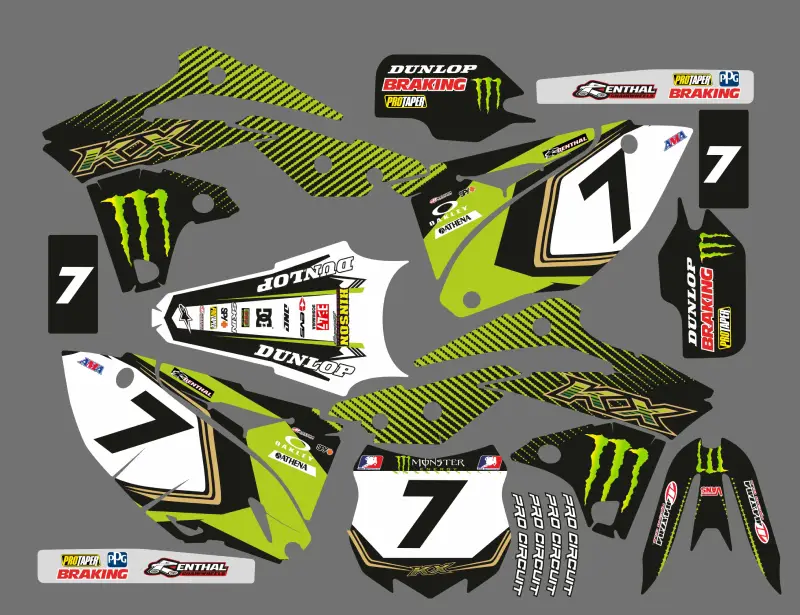 Pour une personnalisation encore plus poussée, vous pouvez customiser votre Kit déco Kawasaki 450 KXF (2012-2015) – Monster avec nos différentes options comme la base du Kit déco, la finition et pourquoi pas ajouter votre pseudo ou bien changer le numéro.