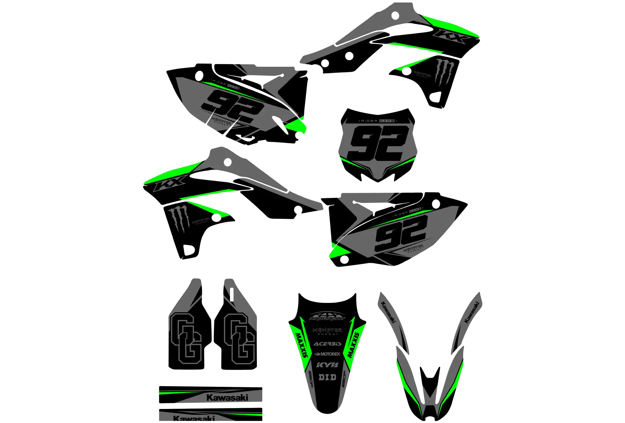 Pour une personnalisation encore plus poussée, vous pouvez customiser votre Kit déco Kawasaki 450 KXF (2012-2015) – Race Vert avec nos différentes options comme la base du Kit déco, la finition et pourquoi pas ajouter votre pseudo ou bien changer le numéro.