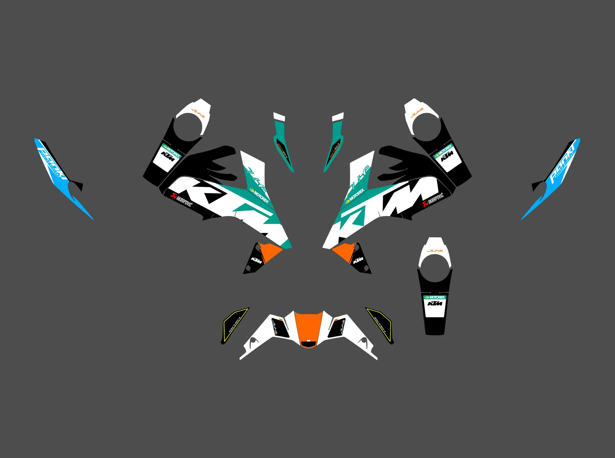 Pour une personnalisation encore plus poussée, vous pouvez customiser votre Kit déco KTM 125 / 390 Duke – Rex avec nos différentes options comme la base du Kit déco, la finition et pourquoi pas ajouter votre pseudo ou bien changer le numéro.