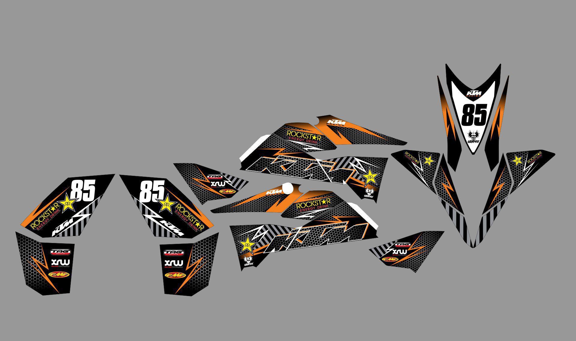 Pour une personnalisation encore plus poussée, vous pouvez customiser votre Kit déco KTM 450 / 525 XC ATV – Sombre avec nos différentes options comme la base du Kit déco, la finition et pourquoi pas ajouter votre pseudo ou bien changer le numéro.