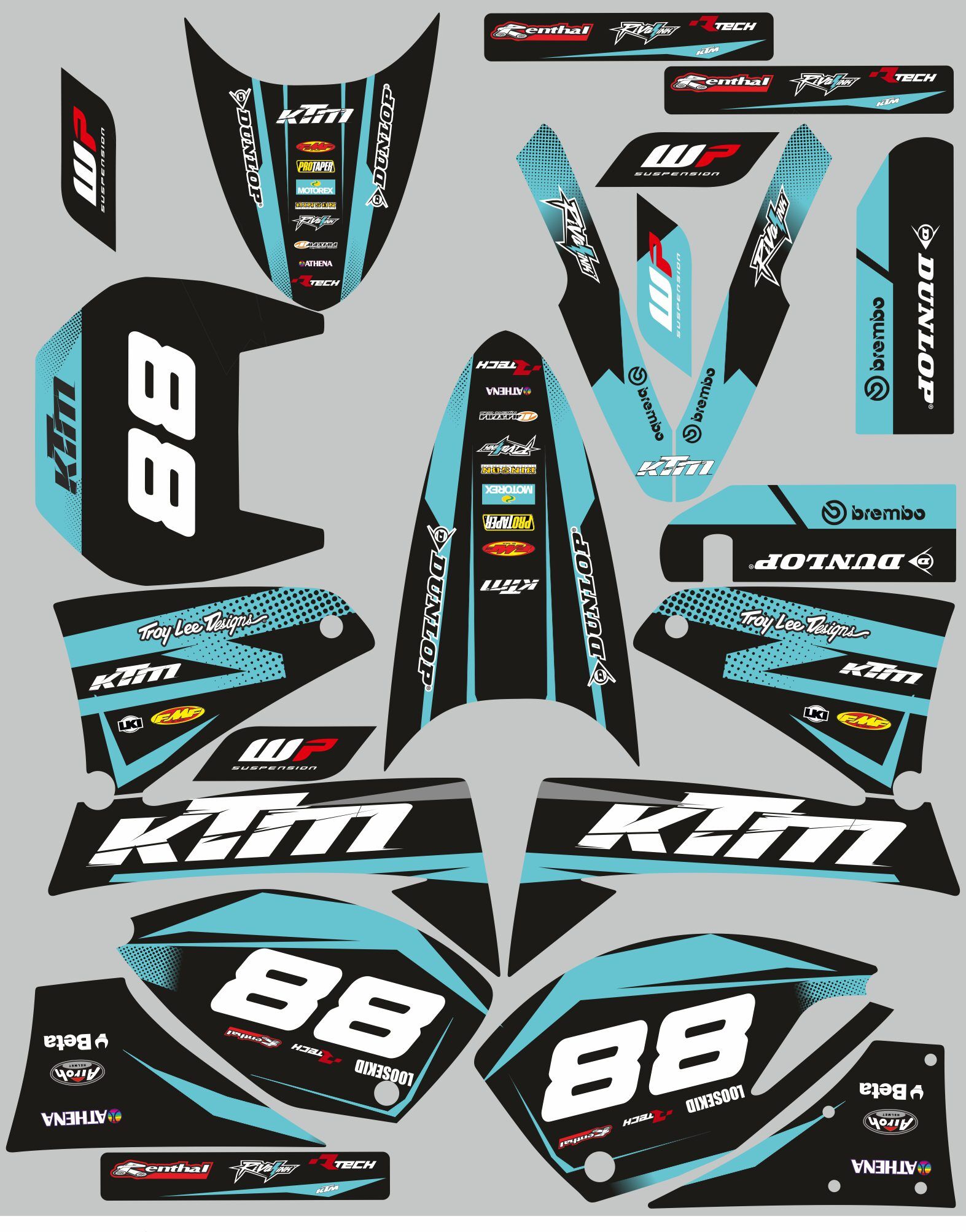 Pour une personnalisation encore plus poussée, vous pouvez customiser votre Kit déco KTM 640 LC4 – Bleu avec nos différentes options comme la base du Kit déco, la finition et pourquoi pas ajouter votre pseudo ou bien changer le numéro.