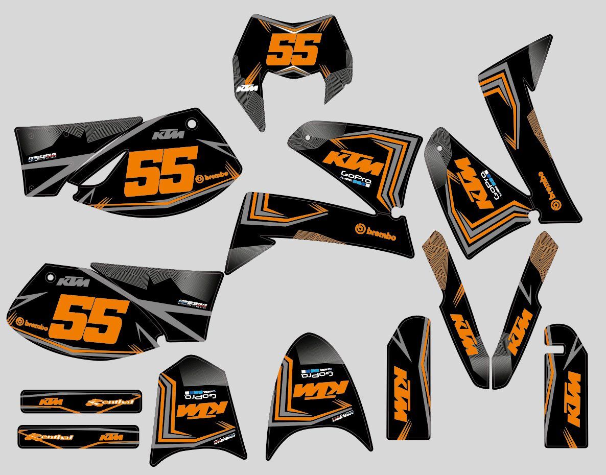 Pour une personnalisation encore plus poussée, vous pouvez customiser votre Kit déco KTM 640 LC4 – Line avec nos différentes options comme la base du Kit déco, la finition et pourquoi pas ajouter votre pseudo ou bien changer le numéro.
