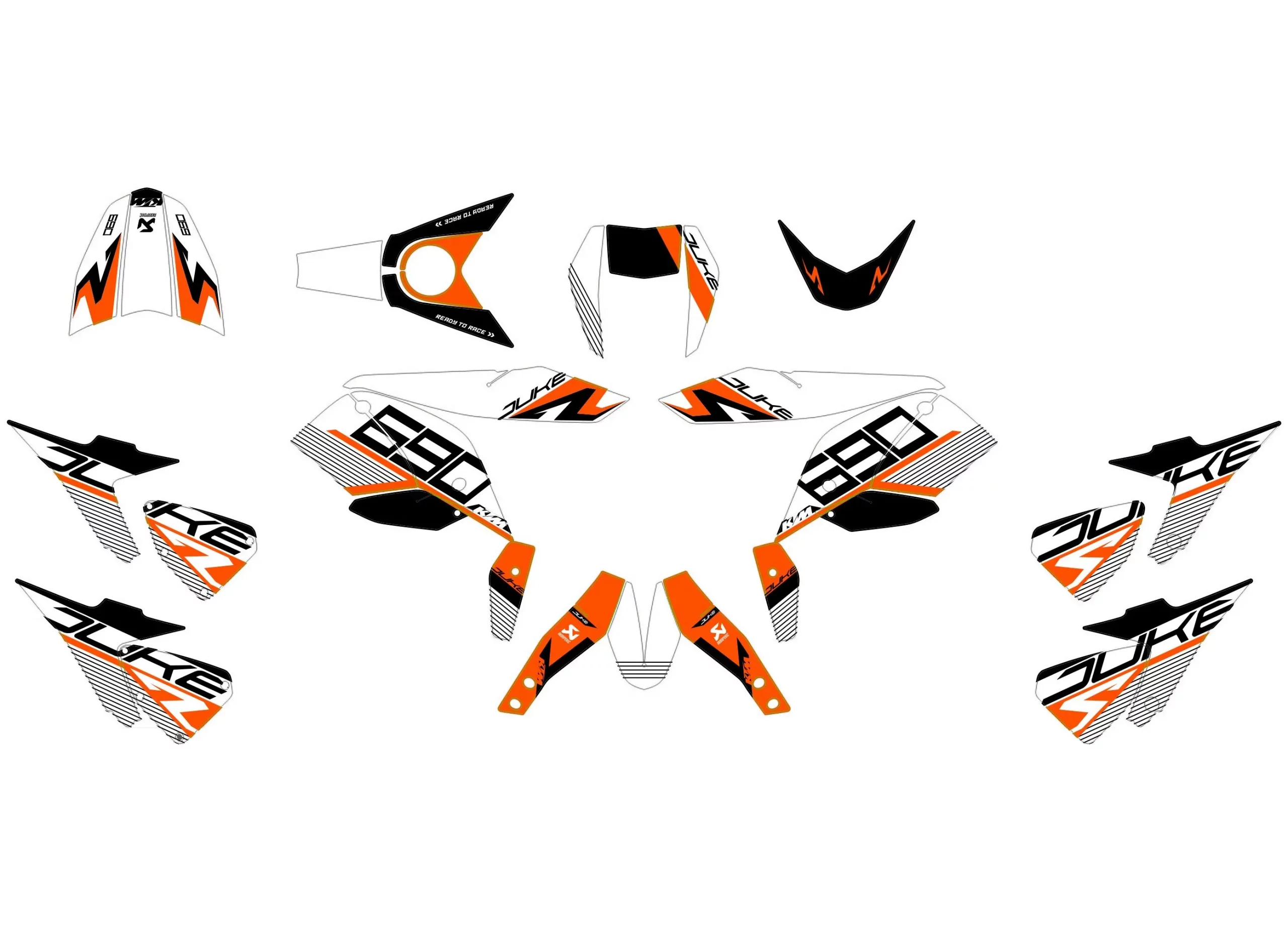 Pour une personnalisation encore plus poussée, vous pouvez customiser votre Kit déco KTM 690 Duke – Factory avec nos différentes options comme la base du Kit déco, la finition et pourquoi pas ajouter votre pseudo ou bien changer le numéro.