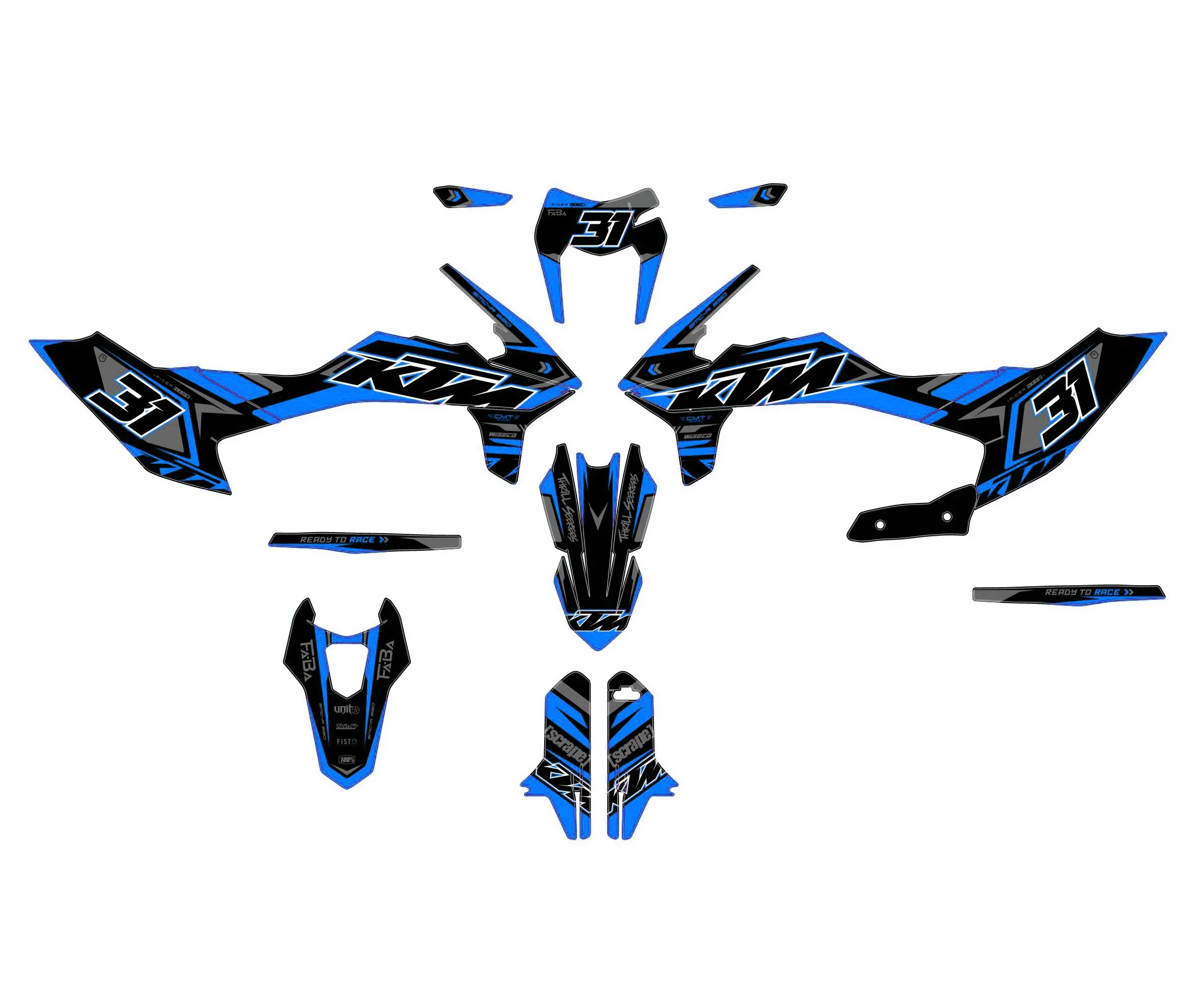 Pour une personnalisation encore plus poussée, vous pouvez customiser votre Kit déco KTM 690 SMCR (2019-2024) – Airon Bleu avec nos différentes options comme la base du Kit déco, la finition et pourquoi pas ajouter votre pseudo ou bien changer le numéro.