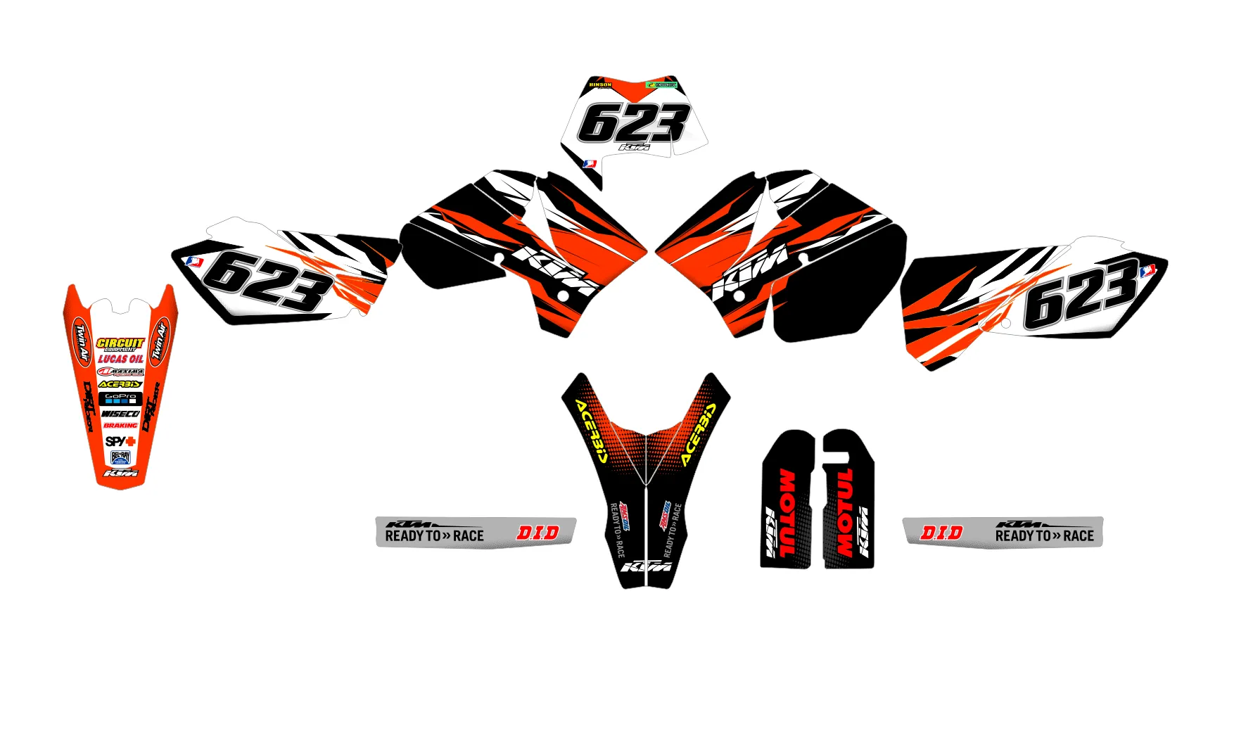 Kitdeco-moto.fr vous propose ce kit déco compatible pour KTM EXC / EXC-F 125 200 250 300 350 400 450 500 530 de 2004 à 2007 !