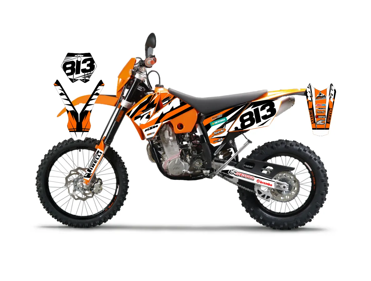 Kitdeco-moto.fr vous propose ce kit déco compatible pour KTM EXC / EXC-F 125 200 250 300 350 400 450 500 530 de 2004 à 2007 !