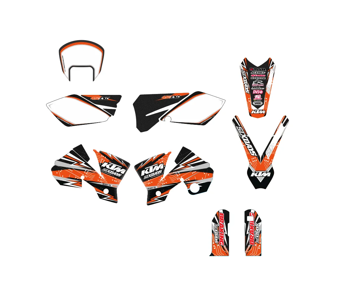 Kitdeco-moto.fr vous propose ce kit déco compatible pour KTM EXC / EXC-F 125 200 250 300 350 400 450 500 530 de 2004 à 2007 !