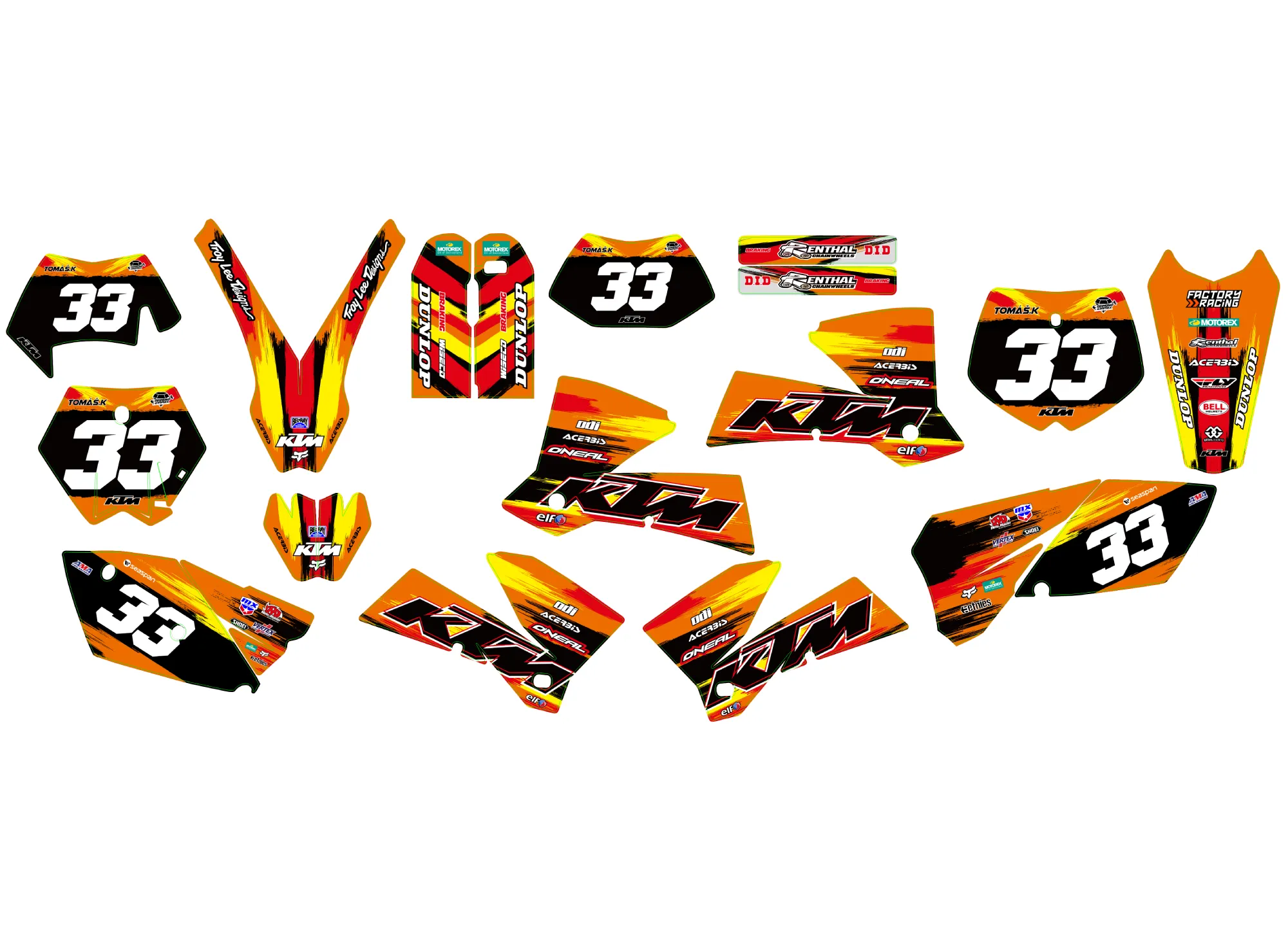 Kitdeco-moto.fr vous propose ce kit déco compatible pour KTM EXC / EXC-F 125 200 250 300 350 400 450 500 530 de 2004 à 2007 !