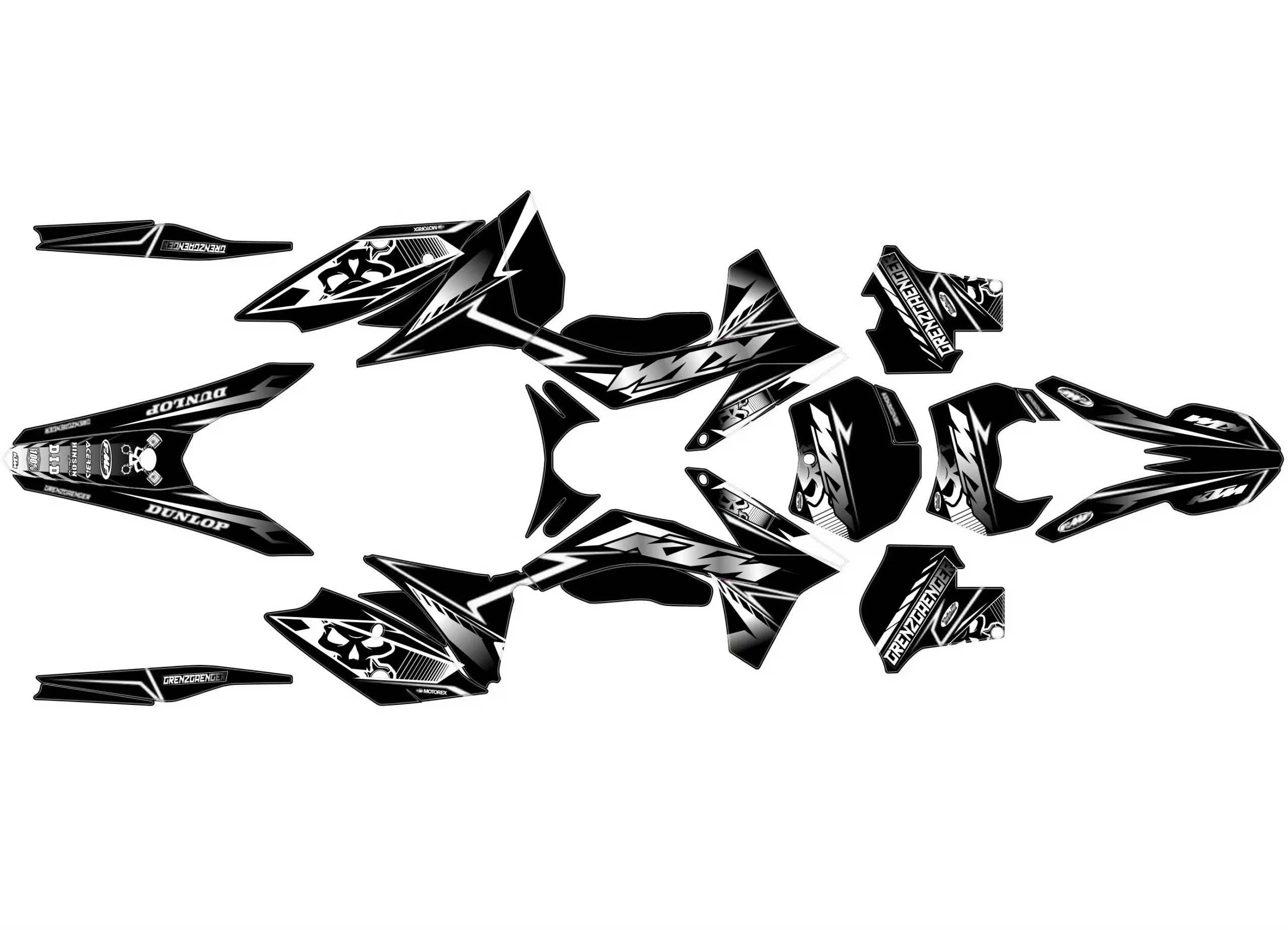 Pour une personnalisation encore plus poussée, vous pouvez customiser votre Kit déco KTM EXC / EXC-F (2012-2013) – Race Blanc avec nos différentes options comme la base du Kit déco, la finition et pourquoi pas ajouter votre pseudo ou bien changer le numéro.