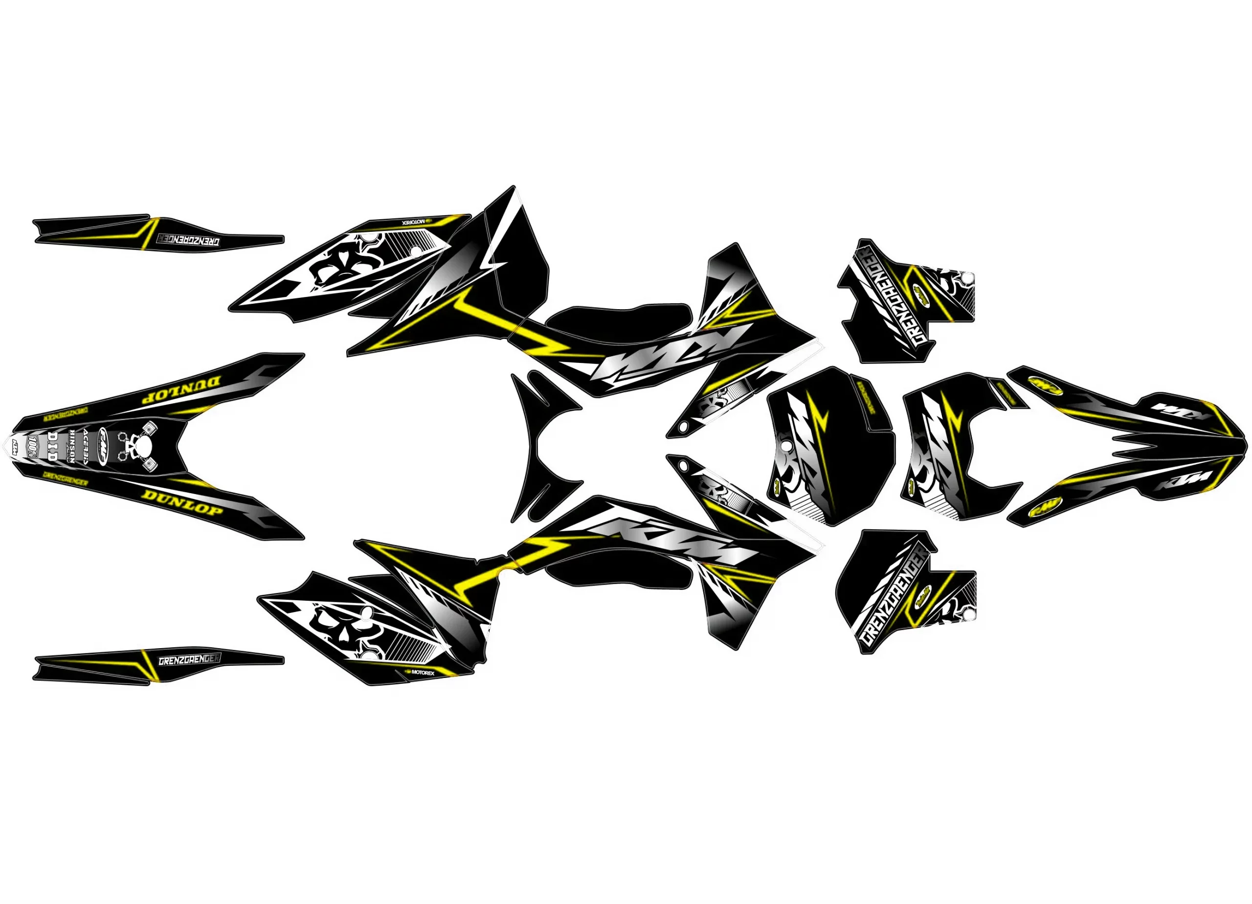 Pour une personnalisation encore plus poussée, vous pouvez customiser votre Kit déco KTM EXC / EXC-F (2012-2013) – Race Jaune avec nos différentes options comme la base du Kit déco, la finition et pourquoi pas ajouter votre pseudo ou bien changer le numéro.