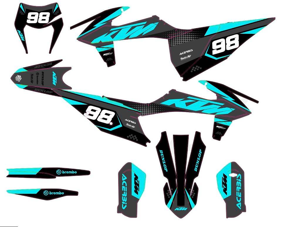Pour une personnalisation encore plus poussée, vous pouvez customiser votre Kit déco KTM EXC / EXC-F (2020-2023) – Factory Bleu avec nos différentes options comme la base du Kit déco, la finition et pourquoi pas ajouter votre pseudo ou bien changer le numéro.