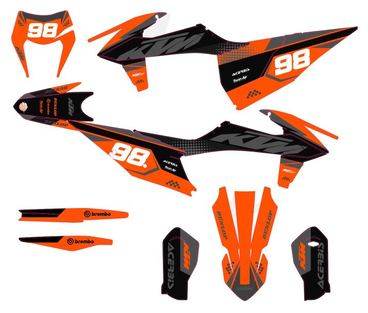 Pour une personnalisation encore plus poussée, vous pouvez customiser votre Kit déco KTM EXC / EXC-F (2020-2023) – Factory Orange #2 avec nos différentes options comme la base du Kit déco, la finition et pourquoi pas ajouter votre pseudo ou bien changer le numéro.