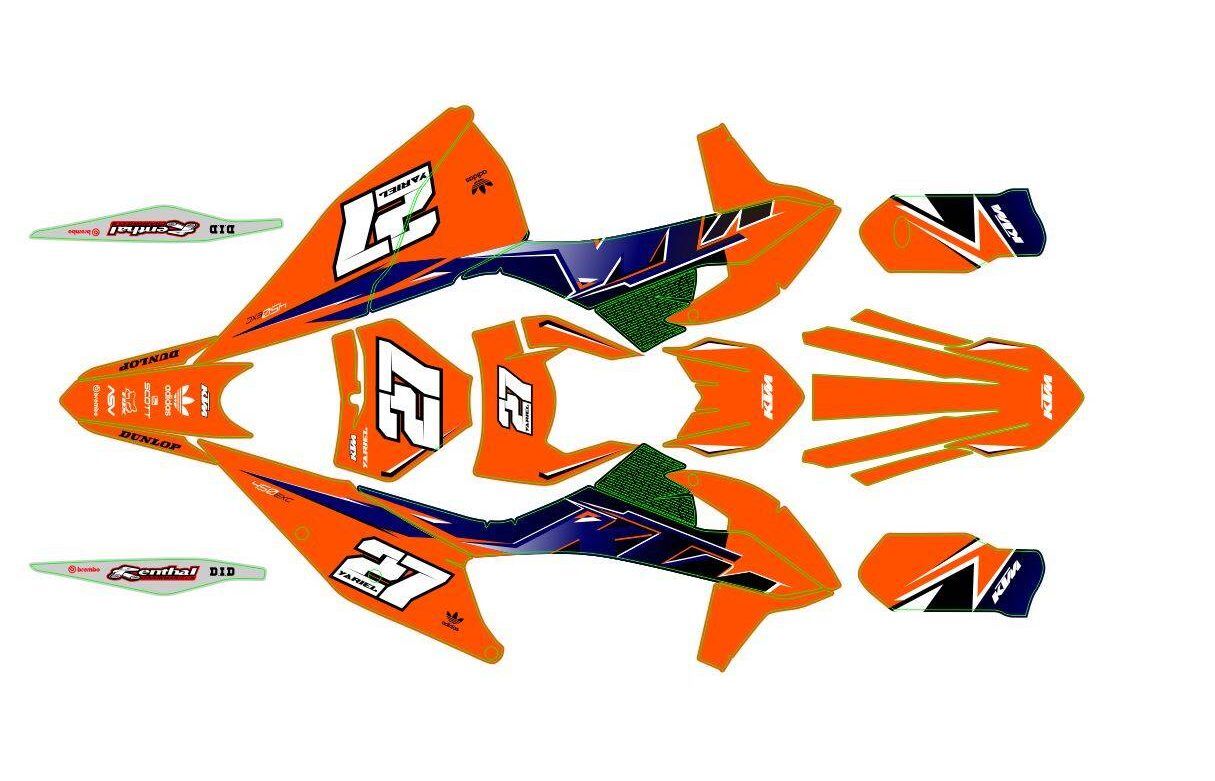 Pour une personnalisation encore plus poussée, vous pouvez customiser votre Kit déco KTM EXC / EXC-F (2020-2023) – Origine avec nos différentes options comme la base du Kit déco, la finition et pourquoi pas ajouter votre pseudo ou bien changer le numéro.