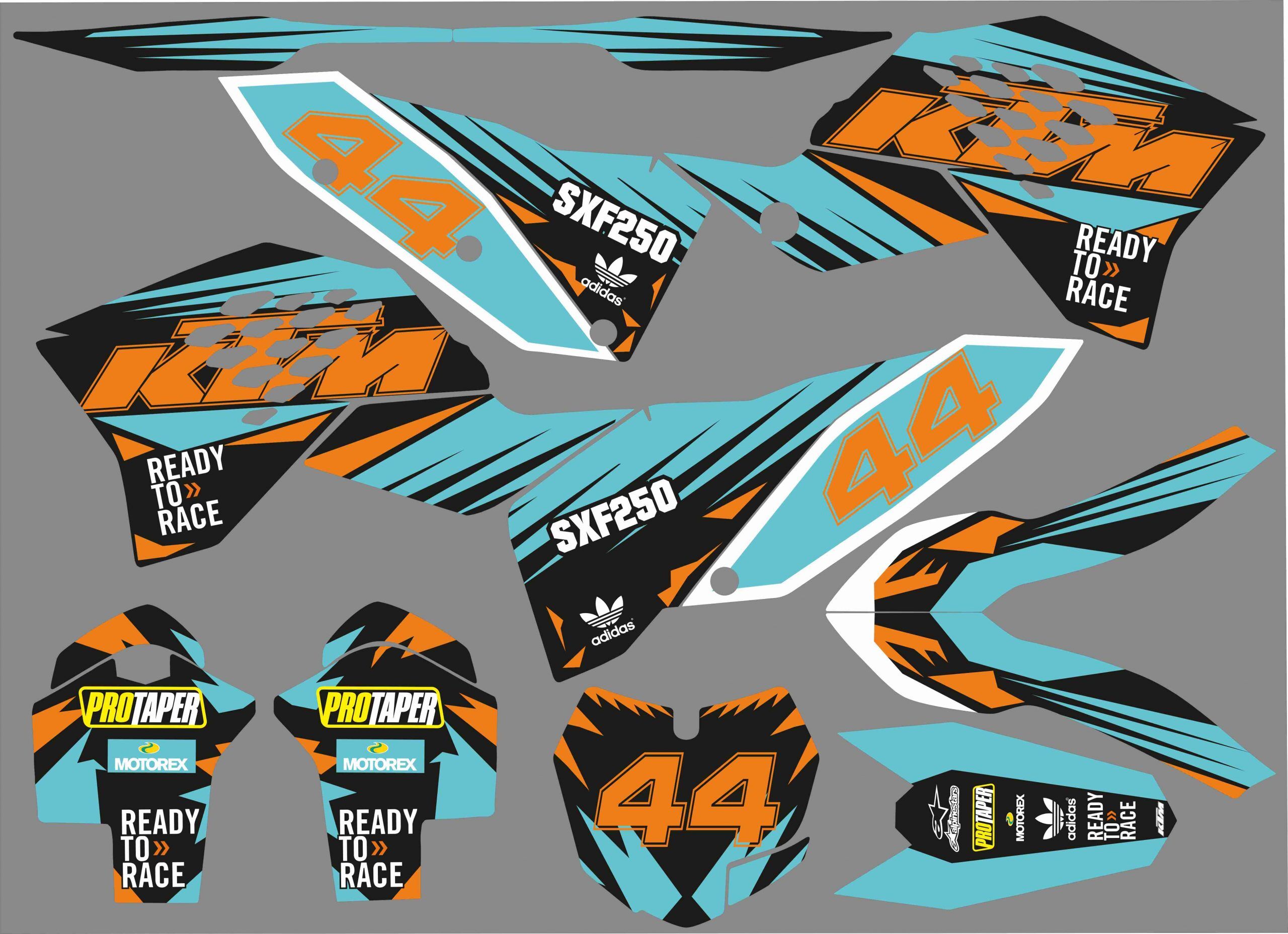 Pour une personnalisation encore plus poussée, vous pouvez customiser votre Kit déco KTM SX / SXF (2007-2010) – Factory Cyan avec nos différentes options comme la base du Kit déco, la finition et pourquoi pas ajouter votre pseudo ou bien changer le numéro.