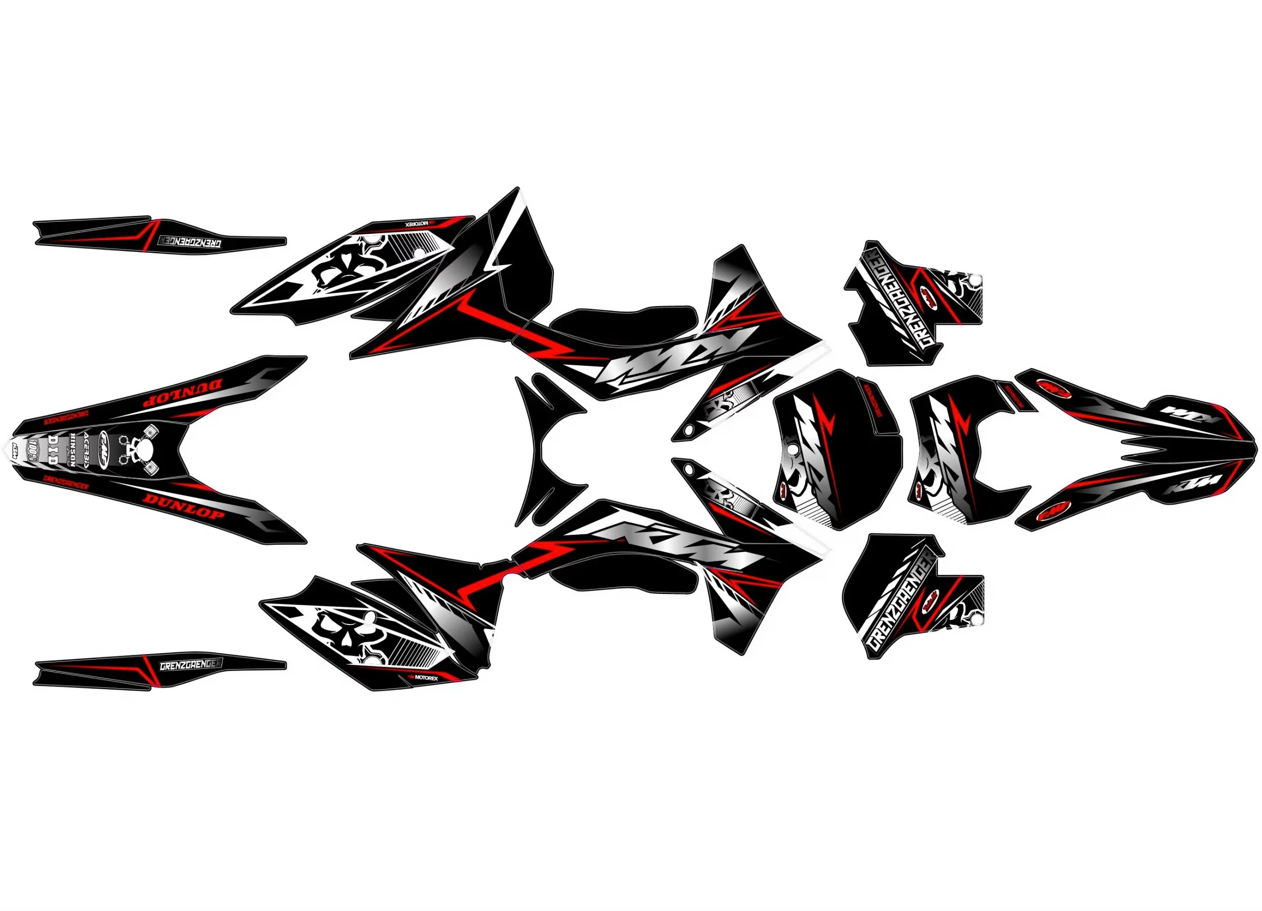 Pour une personnalisation encore plus poussée, vous pouvez customiser votre Kit déco KTM SX / SXF (2011-2012) – Race Rouge avec nos différentes options comme la base du Kit déco, la finition et pourquoi pas ajouter votre pseudo ou bien changer le numéro.