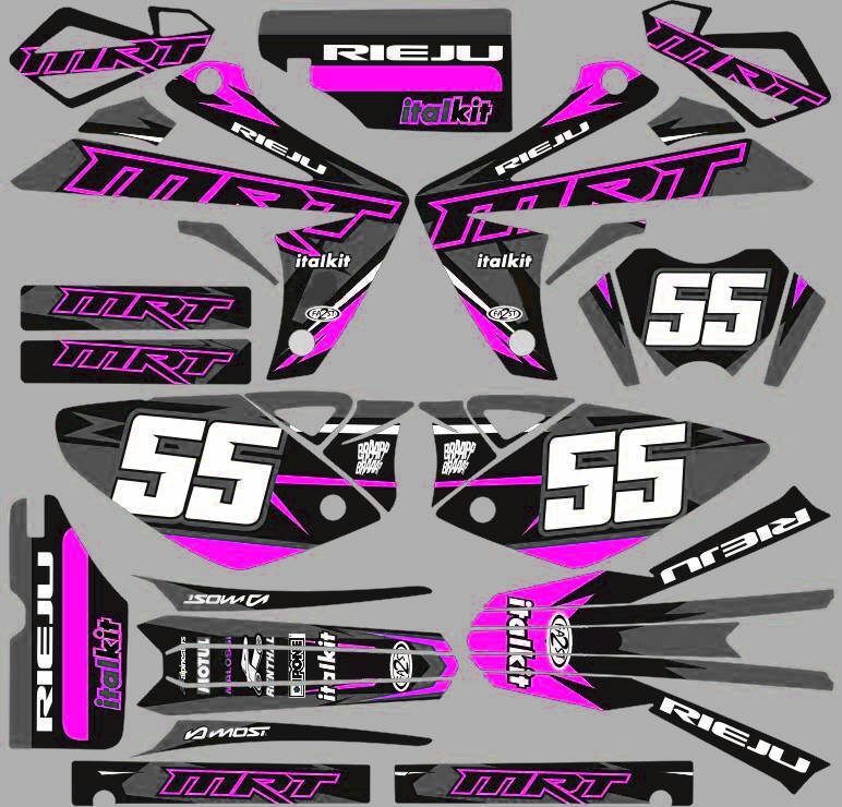 Pour une personnalisation encore plus poussée, vous pouvez customiser votre Kit déco Rieju 50 MRT – Craft Gris / Rose avec nos différentes options comme la base du Kit déco, la finition et pourquoi pas ajouter votre pseudo ou bien changer le numéro.