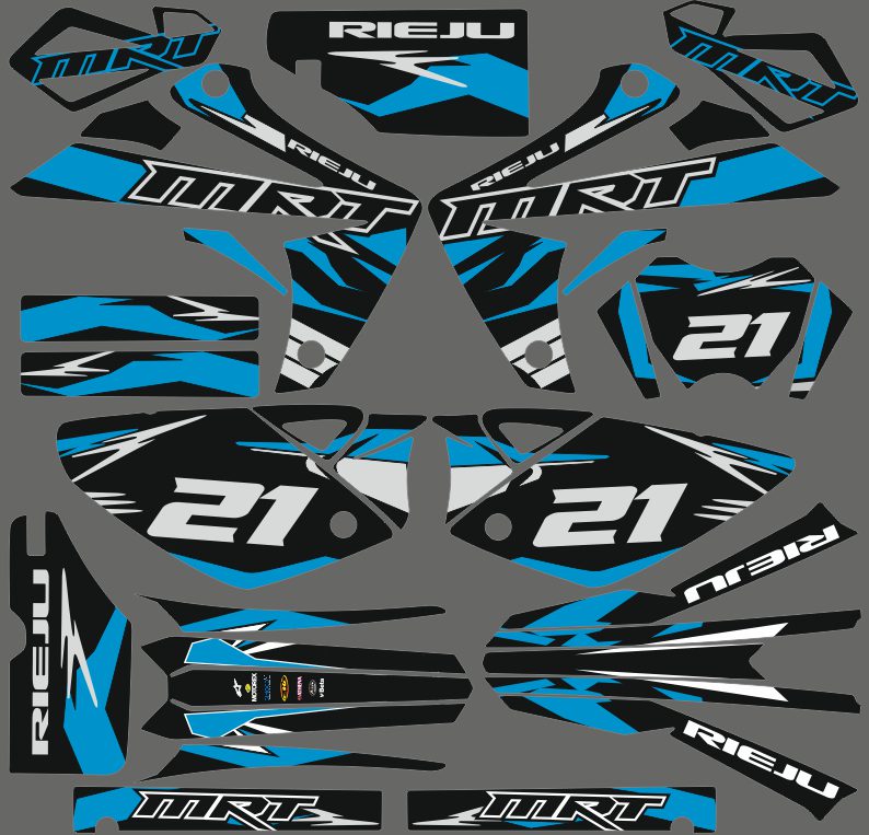 Pour une personnalisation encore plus poussée, vous pouvez customiser votre Kit déco Rieju 50 MRT – Factory Racing Cyan avec nos différentes options comme la base du Kit déco, la finition et pourquoi pas ajouter votre pseudo ou bien changer le numéro.