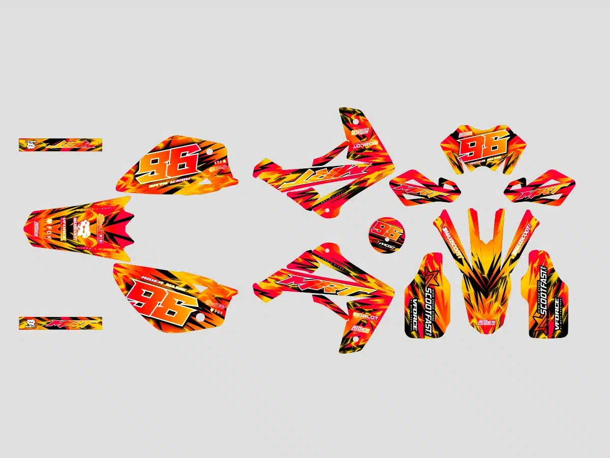 Pour une personnalisation encore plus poussée, vous pouvez customiser votre Kit déco Rieju 50 MRT – Flashy avec nos différentes options comme la base du Kit déco, la finition et pourquoi pas ajouter votre pseudo ou bien changer le numéro.