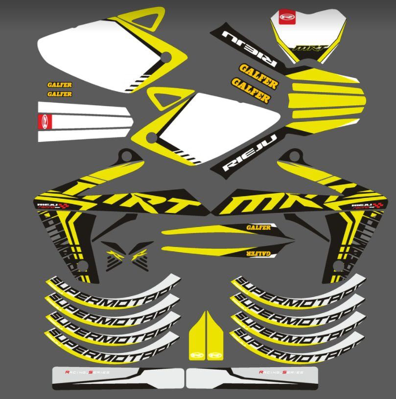 Pour une personnalisation encore plus poussée, vous pouvez customiser votre Kit déco Rieju 50 MRT – Motard Jaune avec nos différentes options comme la base du Kit déco, la finition et pourquoi pas ajouter votre pseudo ou bien changer le numéro.